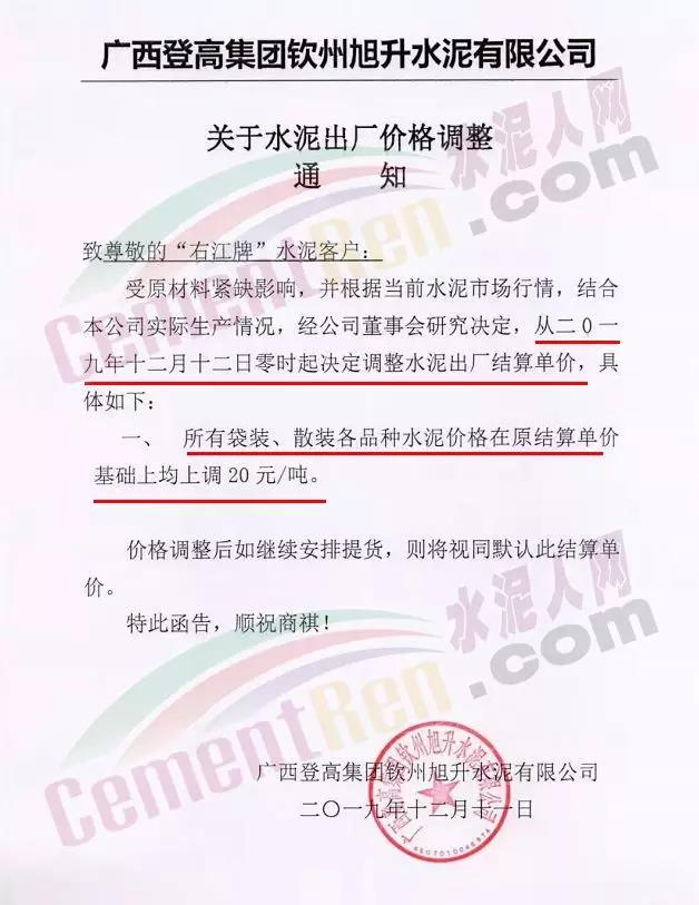 因廠內(nèi)水泥庫(kù)存持續(xù)低位,我司決定于2019年12月10日00:00起,對(duì)興業(yè)的全品項(xiàng)散裝水泥出廠價(jià)格統(tǒng)一上調(diào)20元/噸。對(duì)貴港、桂平、平南、橫縣全品項(xiàng)袋泥、散泥上漲20元/噸。溫馨提示: 價(jià)格調(diào)整后,如繼續(xù)安排車輛到我司提貨,視為確認(rèn)此次價(jià)格調(diào)整!順祝商祺!
