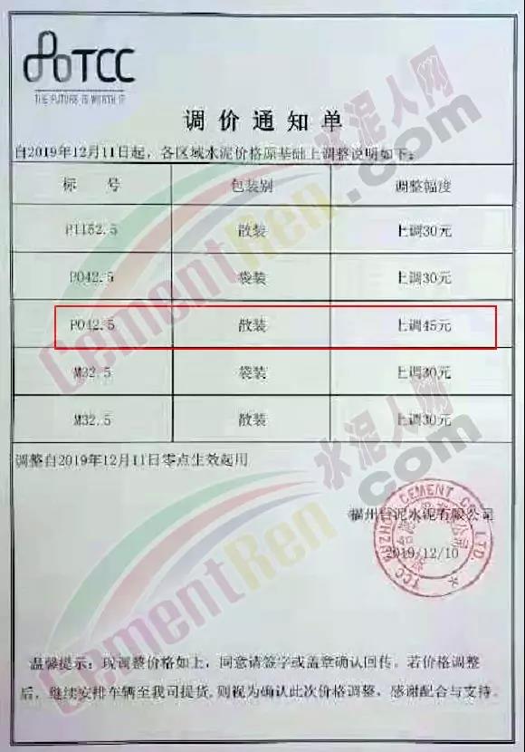 根據(jù)近期市場(chǎng)行情變化,我公司決定于2019年12月12日起,所有品種散裝、袋裝水泥出庫(kù)價(jià)在原有基礎(chǔ)上調(diào)30元/噸。順祝商祺!【福建鼎日實(shí)業(yè)有限公司】