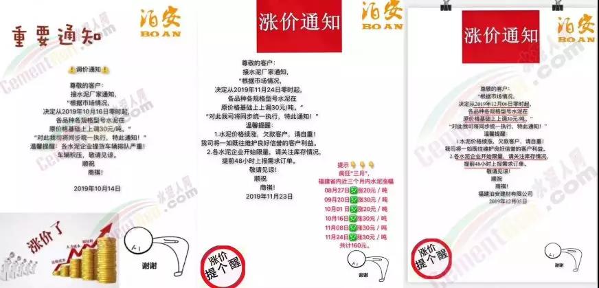 同時(shí),福建區(qū)域也迎來(lái)了新一波的價(jià)格上漲,福建春馳集團(tuán)新豐水泥有限公司通知自2019年12月12日零時(shí)起,發(fā)往省內(nèi)各區(qū)域,各規(guī)格型號(hào)袋、散裝水泥出廠價(jià)格在原來(lái)的基礎(chǔ)上,上調(diào)30元/噸。