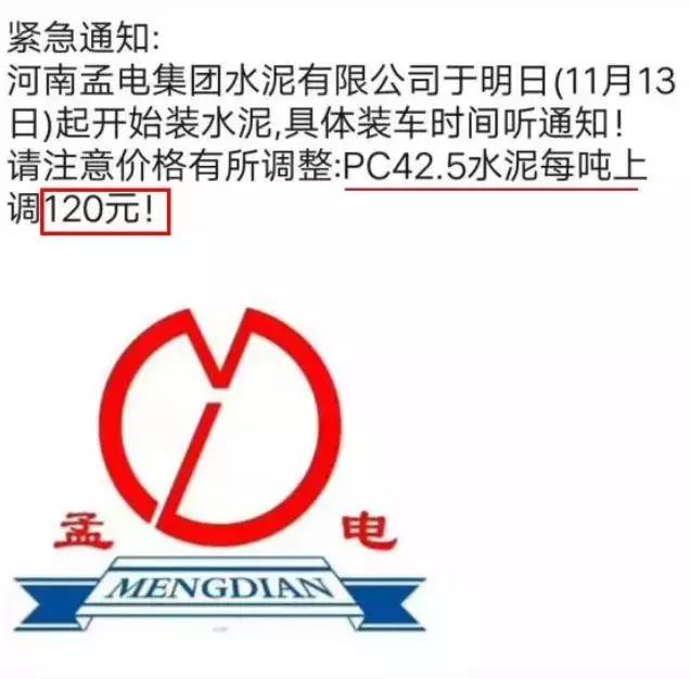 11月12日河南孟電集團(tuán)水泥有限公司發(fā)布緊急通知稱:自11月13日起,PC42.5水泥每噸上調(diào)120元/噸,孟電水泥一鳴驚人,再次創(chuàng)下了近年水泥行業(yè)單次水泥價(jià)格上調(diào)幅最高的記錄。
