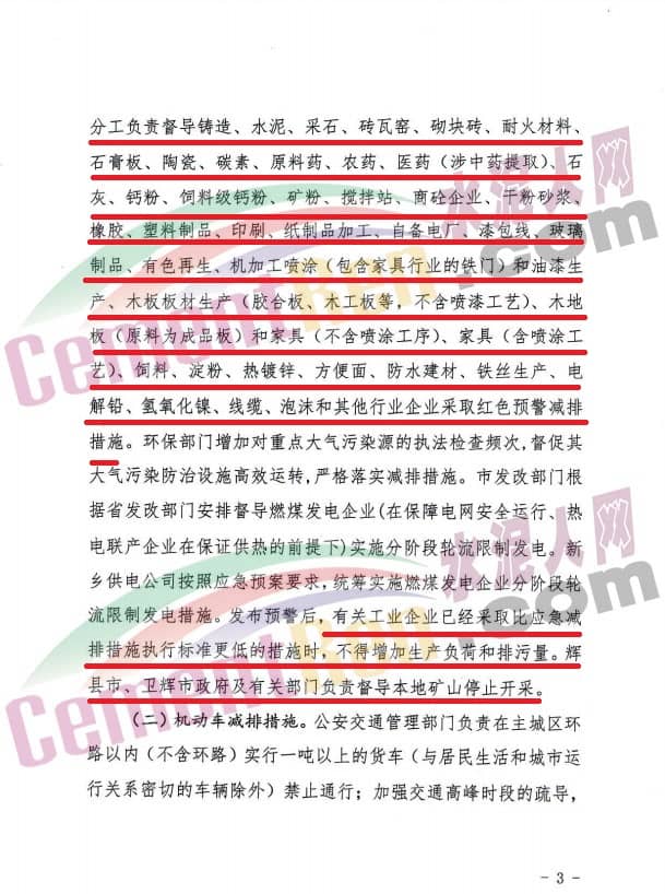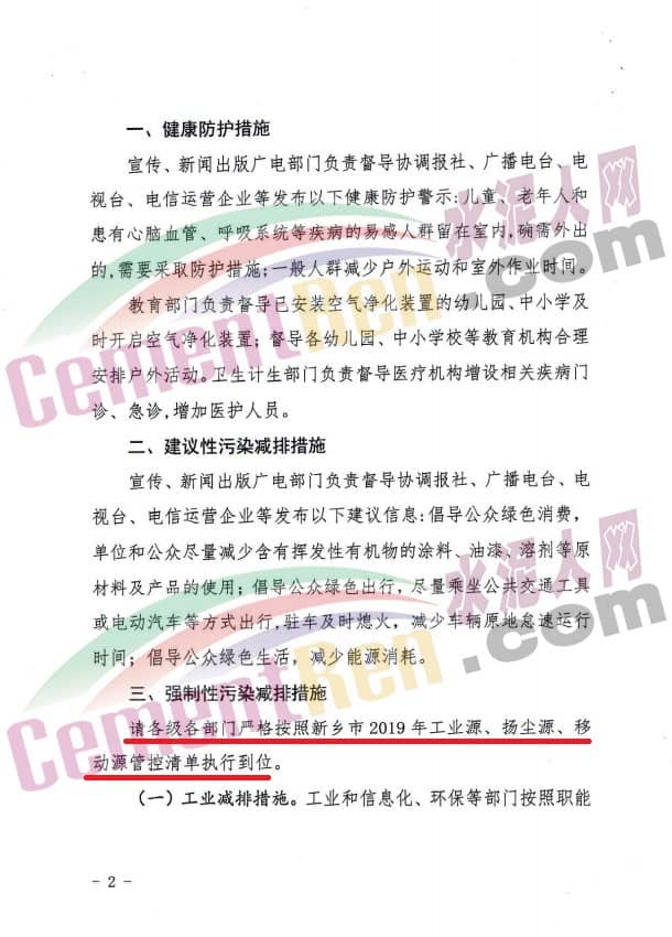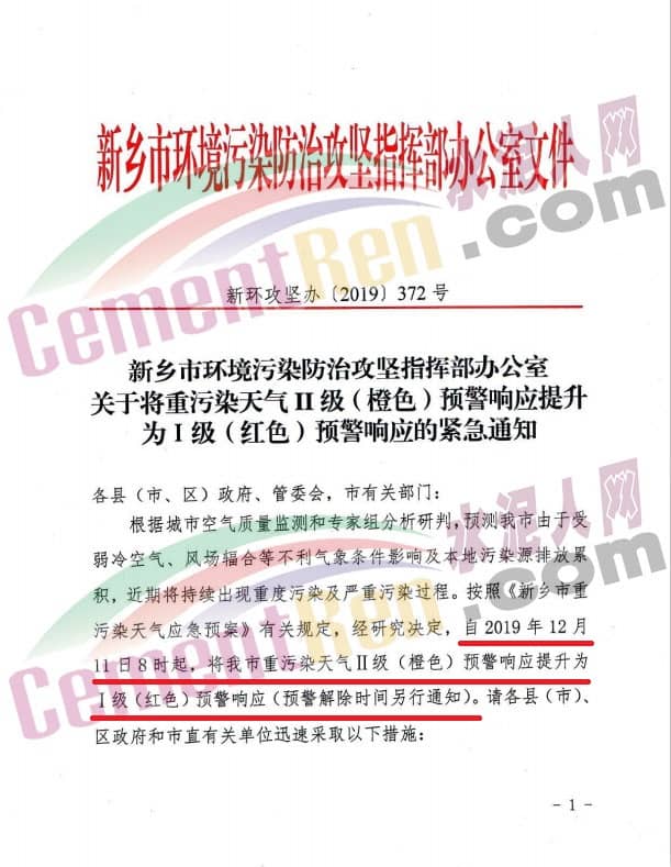 河南省新鄉(xiāng)市 12月11日,河南省新鄉(xiāng)市環(huán)境污染防治攻堅(jiān)指揮部辦公室發(fā)布了《關(guān)于將重污染天氣二級(jí)(橙色)預(yù)警響應(yīng)提升為一級(jí)(紅色)預(yù)警響應(yīng)的緊急通知》稱,根據(jù)新鄉(xiāng)市空氣質(zhì)量檢測(cè)和專家組分析研判,預(yù)測(cè)新鄉(xiāng)市由于受弱冷空氣、風(fēng)場輻合等不利氣象條件影響及本地污染源排放累計(jì),近期將持續(xù)出現(xiàn)重污染及嚴(yán)重污染過程。按照《新鄉(xiāng)市重污染天氣應(yīng)急預(yù)案》有關(guān)規(guī)定,經(jīng)研究決定,自2019年12月11日8時(shí)起,將新鄉(xiāng)市重污染天氣二級(jí)(橙色)預(yù)警響應(yīng)提升為一級(jí)(紅色)預(yù)警響應(yīng)(預(yù)警解除時(shí)間另行通知),具體減排措施如下: