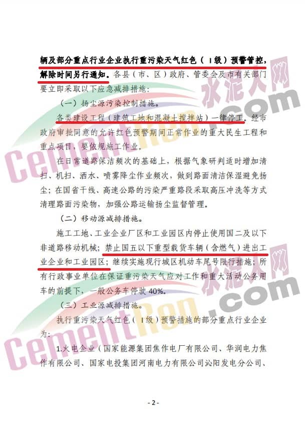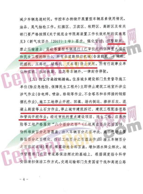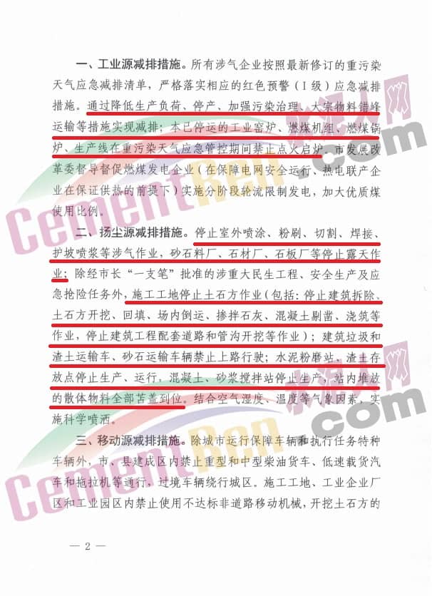1、礦山、沙石料廠、石材廠、石板廠等停止露天作業(yè);施工工地停止土石方作業(yè)、建筑拆除、噴涂粉刷、護(hù)坡噴漿、混凝土攪拌等;主干道和易產(chǎn)生揚(yáng)塵路段增加機(jī)掃頻次;未安裝密閉裝置易產(chǎn)生遺撒的煤炭、渣土、砂石料等運(yùn)輸車輛停止上路。