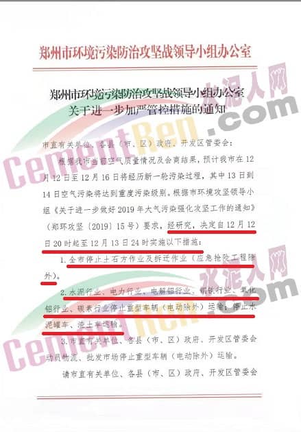 12月11日,河南省鄭州市環(huán)境污染防治攻堅(jiān)戰(zhàn)領(lǐng)導(dǎo)小組辦公室發(fā)布了《關(guān)于進(jìn)一步加嚴(yán)管控措施的通知》稱,根據(jù)河南省鄭州市當(dāng)前空氣質(zhì)量情況及會(huì)商結(jié)果,預(yù)計(jì)鄭州市自愛12月12日至12月16日將經(jīng)歷新一輪污染過程,其中13日到14日空氣污染將達(dá)到重度污染級(jí)別。根據(jù)鄭州市環(huán)境攻堅(jiān)辦領(lǐng)導(dǎo)小組《關(guān)于進(jìn)一步做好2019年大氣污染強(qiáng)化攻堅(jiān)工作的通知》,經(jīng)研究,決定自12月12日20時(shí)起至12月13日24時(shí)實(shí)施,具體減排措施如下: