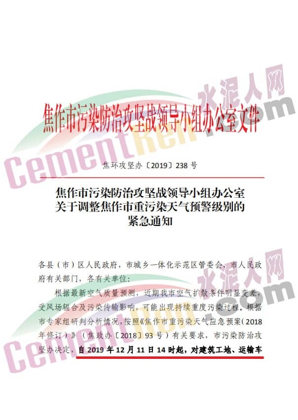 12月10日,河南省焦作市污染防治攻堅(jiān)戰(zhàn)領(lǐng)導(dǎo)小組發(fā)布了《關(guān)于調(diào)整焦作市重污染天氣預(yù)警級(jí)別的緊急通知》稱,根據(jù)最新空氣質(zhì)量預(yù)測(cè),近期焦作市空氣擴(kuò)散條件明顯變差,受風(fēng)場輻合及污染傳輸影響,可能出現(xiàn)持續(xù)重污染過程,根據(jù)市專家組研判分析情況,按照《焦作市重污染天氣應(yīng)急預(yù)案(2019年修訂)》(焦政辦[2018]93號(hào))有關(guān)要求,市污染防治攻堅(jiān)辦決定,自2019年12月11日14時(shí)起,對(duì)建筑工地、運(yùn)輸車輛及部分重點(diǎn)行業(yè)企業(yè)執(zhí)行重污染天氣紅色(一)預(yù)警管控,解除時(shí)間另行通知。具體減排措施如下: