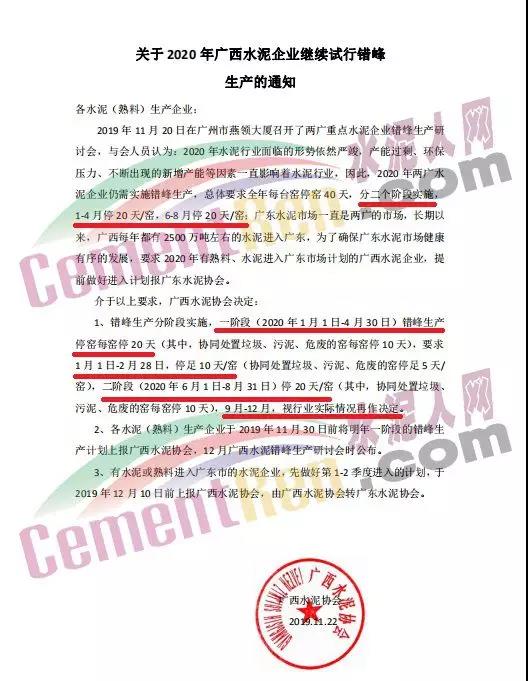 之前廣西水泥協(xié)會下發(fā)了《關(guān)于2020年廣西水泥企業(yè)繼續(xù)試行錯峰生產(chǎn)的通知》提出,2020年兩廣水泥企業(yè)仍需實施錯峰生產(chǎn),總體要求全年每臺窯停窯 40 天,分兩個階段實施,1-4月停20天/窯,6-8 月停 20 天/窯。長期以來,廣西每年都有 2500 萬噸左右的水泥進入廣東,為了確保廣東水泥市場健康有序的發(fā)展,要求2020年有熟料、水泥進入廣東市場計劃的廣西水泥企業(yè),提前做好進入計劃。