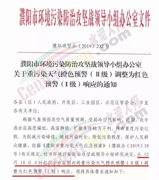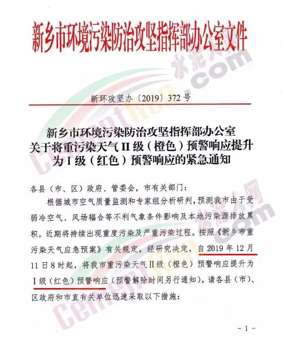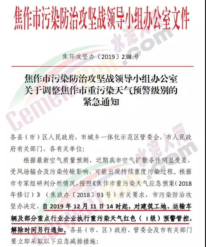 焦作市污染防治攻堅戰(zhàn)領(lǐng)導(dǎo)小組辦公室通知自12月11日14時起對建筑工地、運輸車輛及部分重點行業(yè)企業(yè)執(zhí)行重污染天氣紅色(I級)預(yù)警管控。通知要求執(zhí)行重污染天氣紅色( I 級)預(yù)警措施的水泥粉磨站企業(yè)為焦作堅固水泥有限公司、焦作千業(yè)水泥有限 責任公司、焦作市中晶水泥有限責任公司、焦作市賽雪白水泥有 限公司、博愛金隅水泥有限公司、沁陽市金隅水泥有限公司、焦作市鵬遠水泥有限公司、焦作市永石水泥廠、沁陽市太華建材有 限公司、焦作市丹陽水泥有限公司。同時,礦山停止作業(yè)。