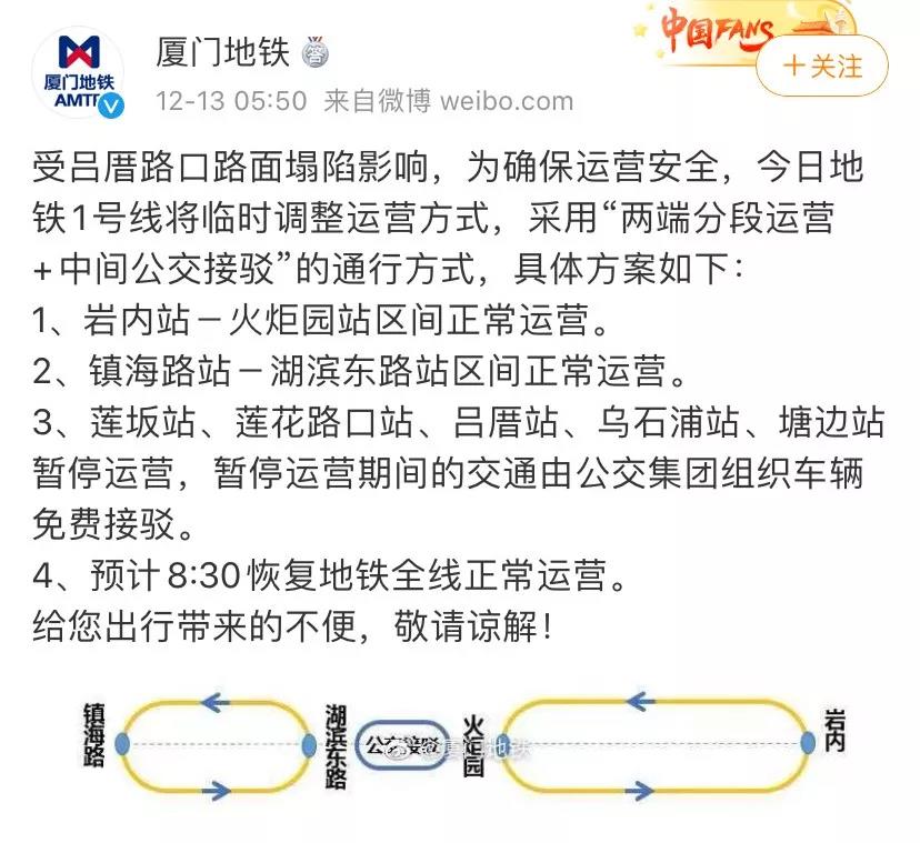 關(guān)于此次呂厝地陷導(dǎo)致水管破裂的事故,2019年12日23時50分左右,廈門日報從廈門水務(wù)集團獲悉,該集團已通過雙回路的另外一路管道供水,市區(qū)水壓已經(jīng)逐步恢復(fù)。截至13日1時,各項措施正在推進中,正組織專家對事故原因進行調(diào)查。今天5:50,@廈門地鐵 再次發(fā)布消息,受呂厝路口路面塌陷影響,廈門地鐵1號線臨時調(diào)整運營方式,蓮坂站、蓮花路口站、呂厝站、烏石浦站、塘邊站暫停運營,暫停運營期間的交通由公交集團組織車輛免費接駁。預(yù)計8:30恢復(fù)地鐵全線正常運營。