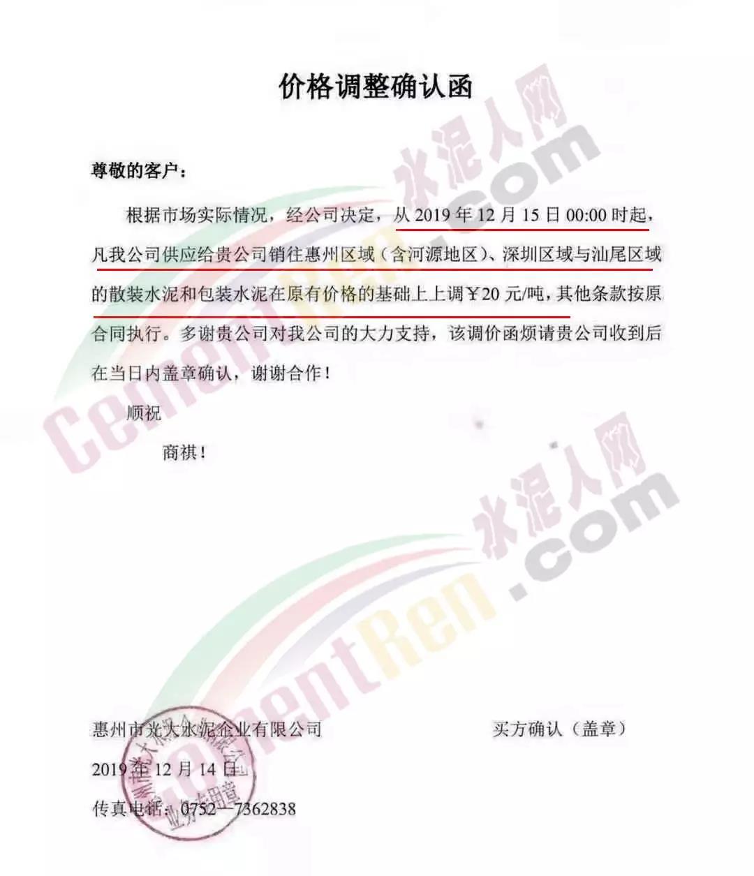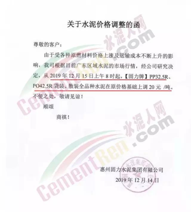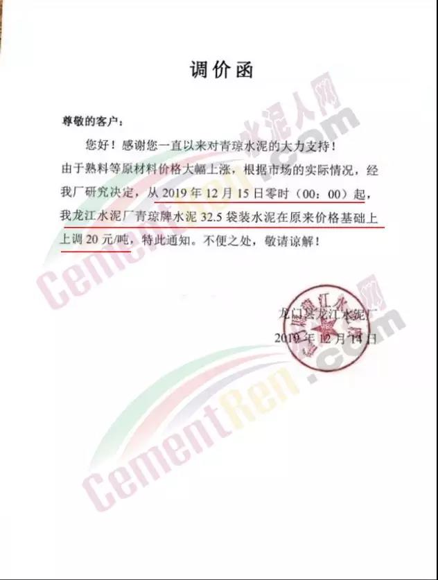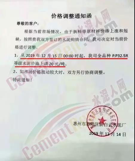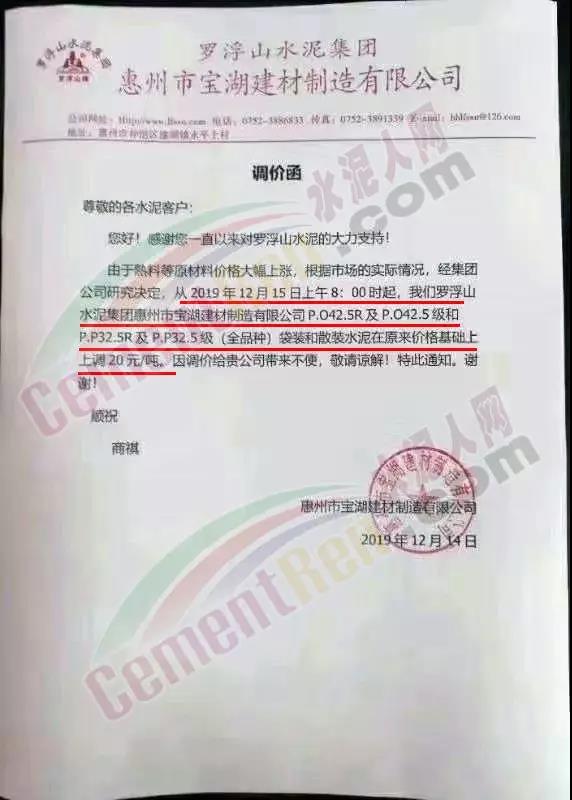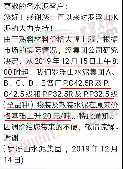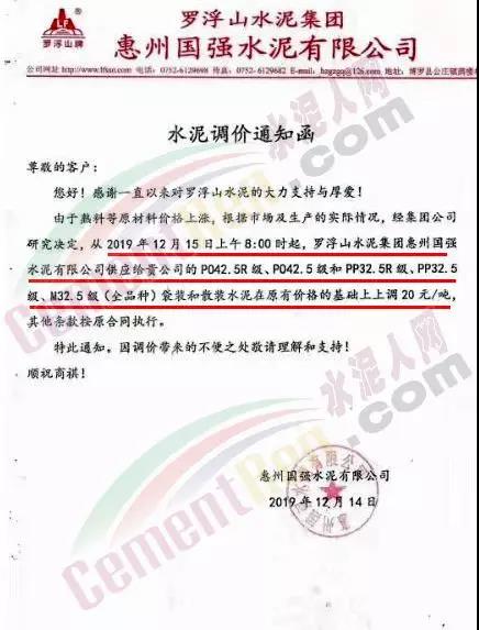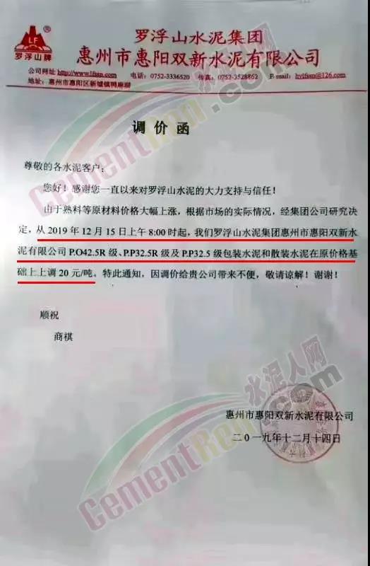 羅浮山水泥集團惠州市惠陽雙新水泥有限公司調(diào)價函稱由于熟料等原材料價格大幅上漲,根據(jù)市場實際情況,經(jīng)集團公司研究決定各標號水泥包裝和散裝水泥在原價基礎(chǔ)上上調(diào)20元/噸。