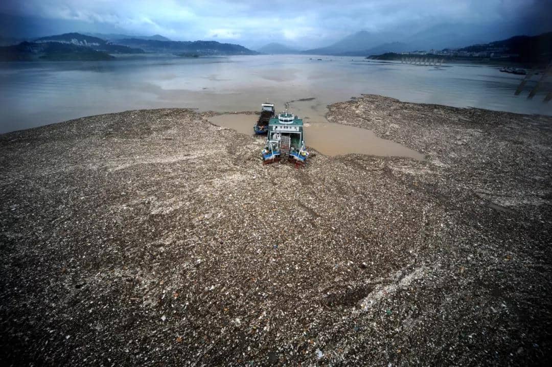 圖為作業(yè)船正在打撈長(zhǎng)江漂浮物