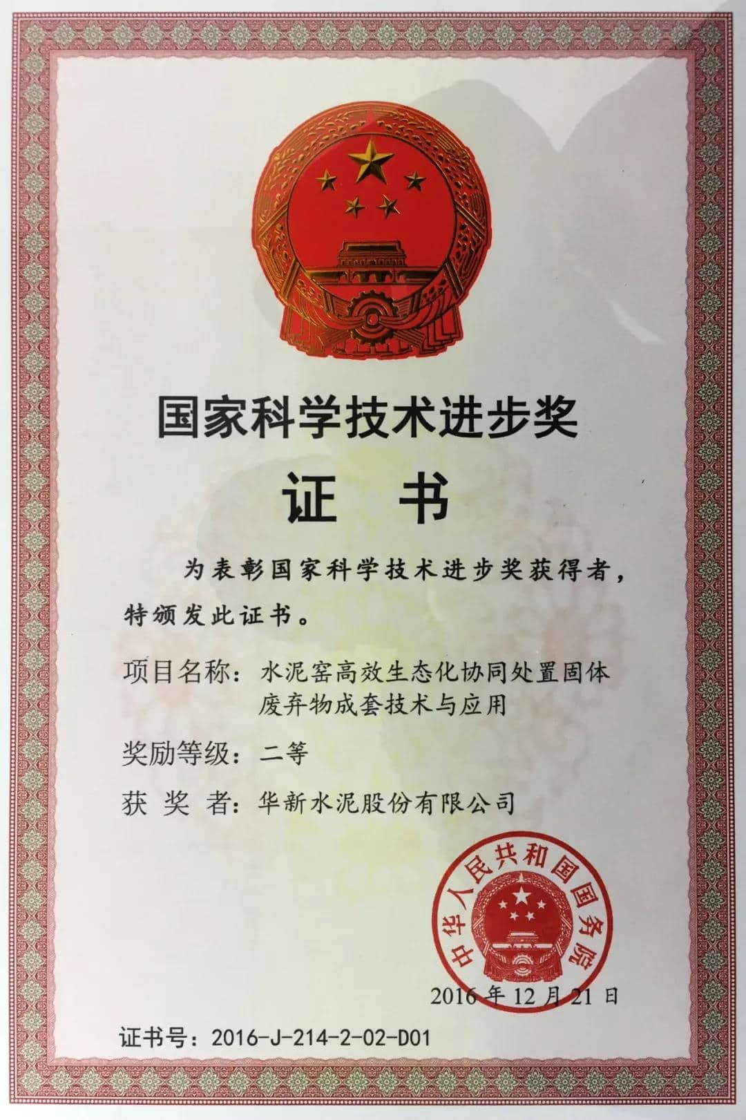 國(guó)家科學(xué)技術(shù)進(jìn)步獎(jiǎng)二等獎(jiǎng)證書