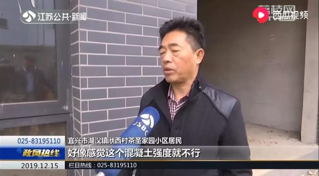 宜興市湖?鎮(zhèn)洑西村茶圣家園小區(qū)居民稱,下完雨以后,它會有積水,房頂上全是水印,混凝土顏色是黃色的,像黃泥巴的顏色。模板撤了以后,鋼筋全部露在外面,感覺這個混凝土強度不夠,用手掰混凝土,都是酥的,輕輕一捏就碎了。