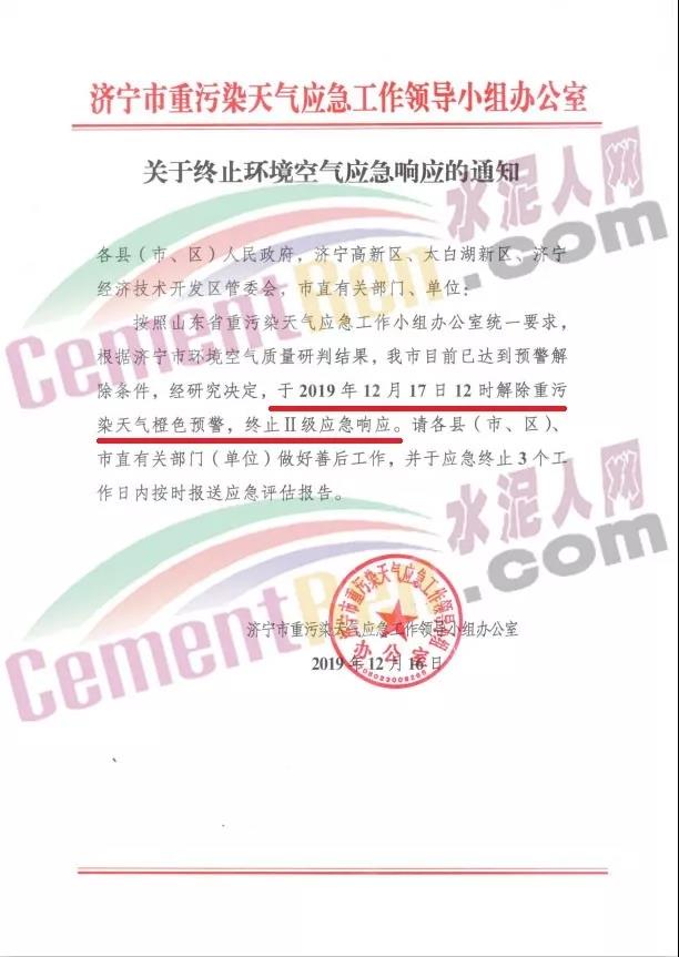 同期,山東省濟(jì)寧市重污染天氣應(yīng)急工作領(lǐng)導(dǎo)小組辦公室發(fā)布了《關(guān)于終止環(huán)境空氣應(yīng)急響應(yīng)的通知》稱,按照山東省重污染天氣應(yīng)急工作小組辦公室統(tǒng)一要求,根據(jù)濟(jì)寧市環(huán)境空氣質(zhì)量研判結(jié)果,濟(jì)寧市目前已達(dá)到預(yù)警解除條件,經(jīng)研究決定,于2019年12月17日12時(shí)解除重污染天氣橙色預(yù)警,終止二級(jí)應(yīng)急響應(yīng)。