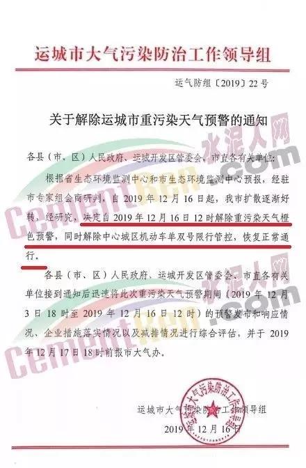 12月16日,山西省運(yùn)城市大氣污染防治工作領(lǐng)導(dǎo)組發(fā)布通知稱,根據(jù)山西省生態(tài)環(huán)境監(jiān)測(cè)中心和市生態(tài)環(huán)境監(jiān)測(cè)中心預(yù)報(bào),經(jīng)運(yùn)城市專家組會(huì)商研判,自2019年12月16日起,運(yùn)城市擴(kuò)散逐漸好轉(zhuǎn),經(jīng)研究,決定自2019年12月16日12時(shí)解除重污染天氣橙色預(yù)警。