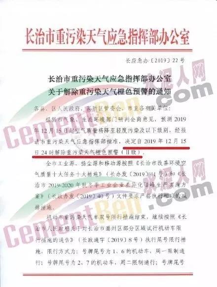 同期,山西長(zhǎng)治市重污染天氣應(yīng)急指揮部辦公室發(fā)布了《關(guān)于解除重污染天氣橙色預(yù)警的通知》稱,根據(jù)市氣象、生態(tài)環(huán)境部門(mén)研判會(huì)商意見(jiàn),預(yù)測(cè)2019年12月15日起空氣質(zhì)量將降至輕度污染及以下級(jí)別,經(jīng)長(zhǎng)治市重污染天氣應(yīng)急指揮部批準(zhǔn),決定自2019年12月15日24時(shí)解除重污染天氣橙色預(yù)警(二級(jí))。