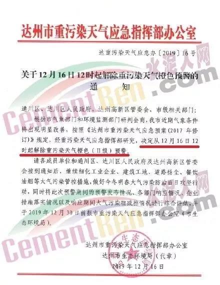 12月16日,四川達(dá)州市重污染天氣應(yīng)急指揮部辦公室、達(dá)州市生態(tài)環(huán)境局聯(lián)合發(fā)布了《關(guān)于12月16日12時(shí)起解除重污染天氣橙色預(yù)警的通知》稱,根據(jù)市氣象部門(mén)和環(huán)境監(jiān)測(cè)部門(mén)研判會(huì)商,達(dá)州市近期氣象條件將出現(xiàn)明顯改善,按照《達(dá)州市重污染天氣應(yīng)急預(yù)案(2017)年修訂》規(guī)定,經(jīng)重污染天氣應(yīng)急指揮部研究,決定從12月16日12時(shí)解除重污染天氣橙色(二級(jí))預(yù)警。