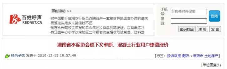 日前,湖南省地方新聞網(wǎng)站紅網(wǎng)《百姓呼聲》欄目刊載耒陽市八家商品混凝土公司的聯(lián)名投訴水泥廠連續(xù)四個月對水泥漲價110元/噸。從七月份起的350元/噸漲到460元/噸。與相鄰區(qū)域差價85元/噸。市場監(jiān)督管理局將介入調(diào)查。