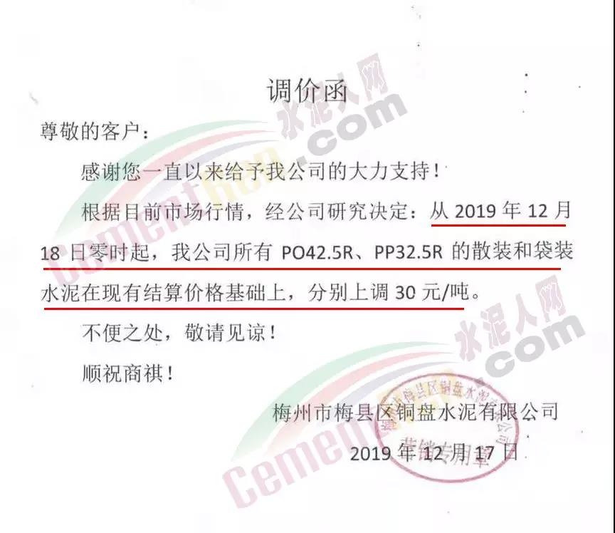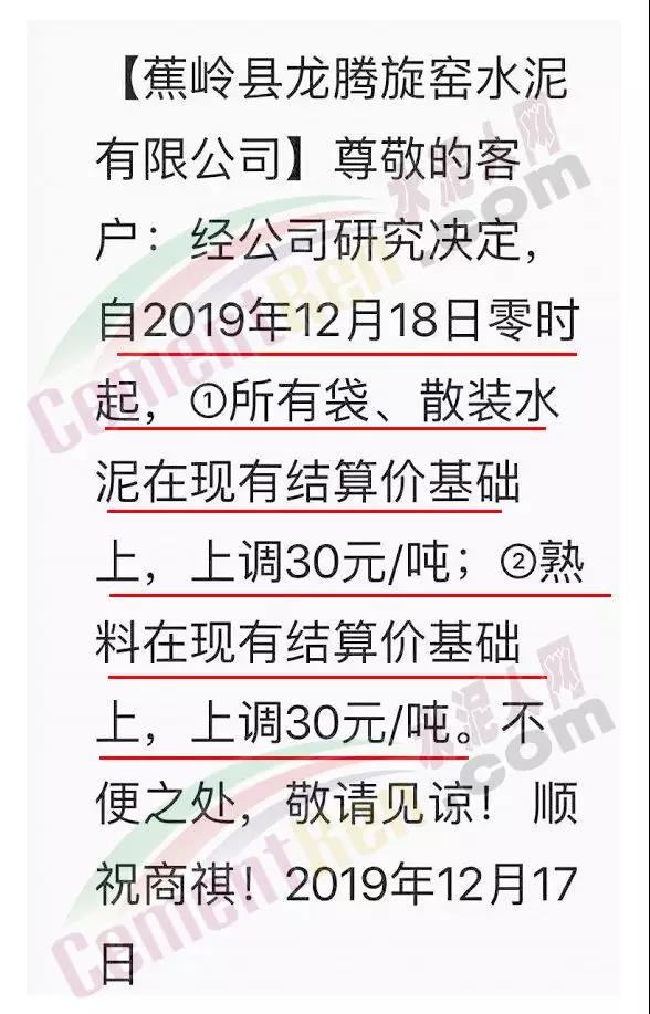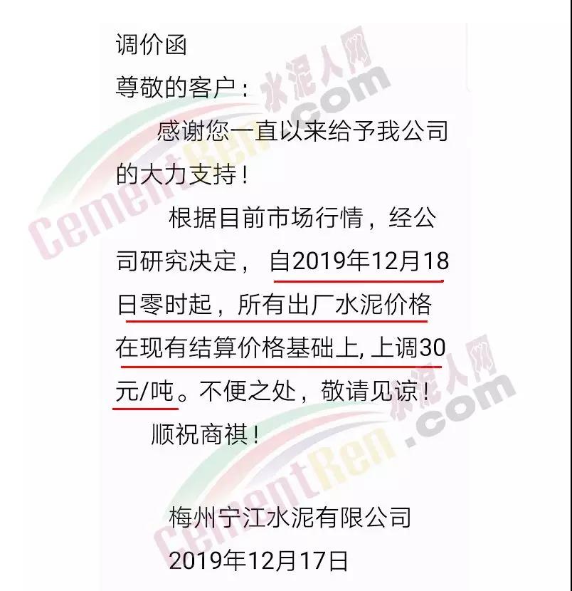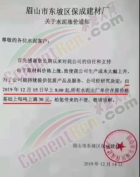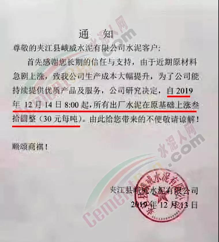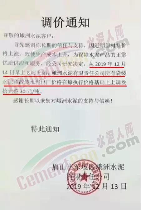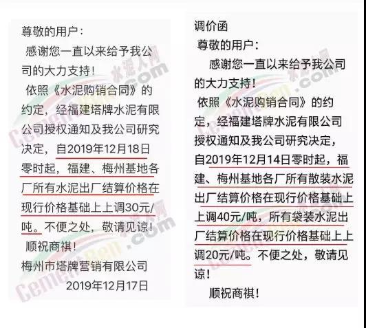 期中,梅州市塔牌營銷通知稱依照《水泥購銷合同》的約定,經(jīng)福建塔牌水泥有限公司授權(quán)通知及我公司研究決定,自2019年12月18日零時起,福建、梅州基地各廠所有水泥出廠結(jié)算價格在現(xiàn)行價格基礎(chǔ)上上調(diào)30元/噸。上周六(14日),這家企業(yè)剛剛通知福建、梅州各基地各廠所有散裝水泥出廠結(jié)算價格在現(xiàn)行價格基礎(chǔ)上上調(diào)40元/噸,所有袋裝水泥出廠結(jié)算價格在現(xiàn)行價格基礎(chǔ)上上調(diào)20元/噸。