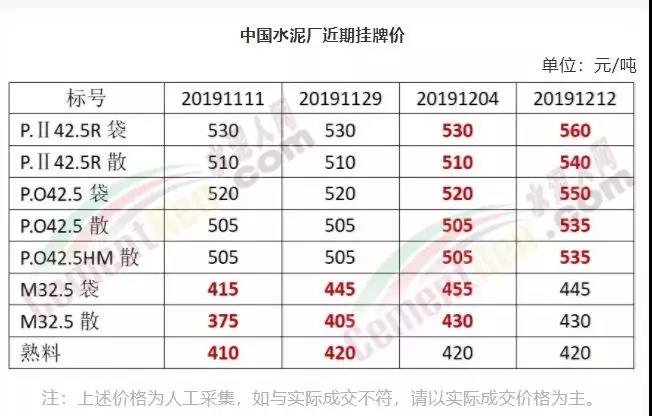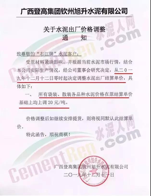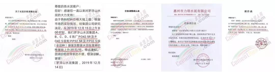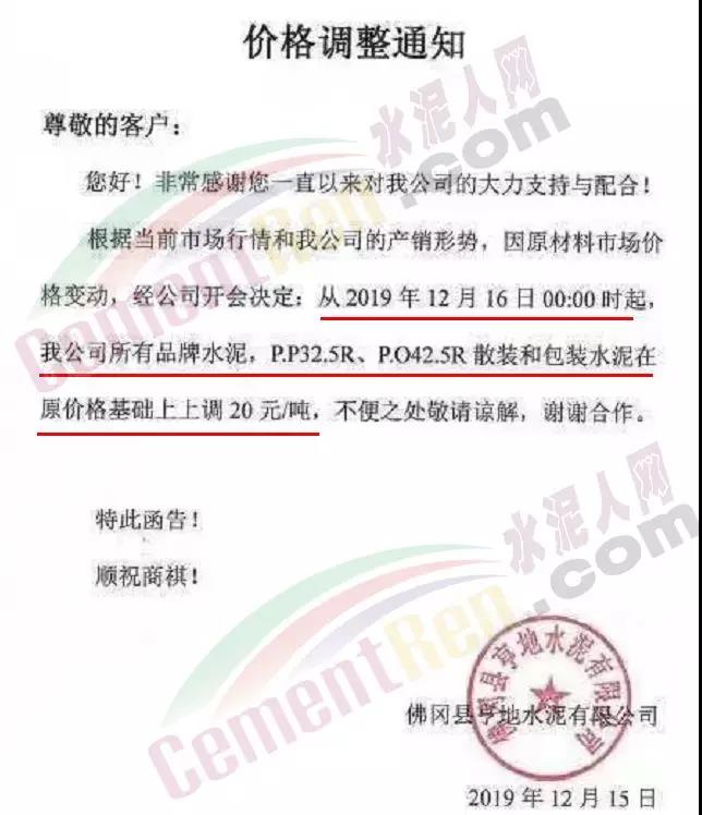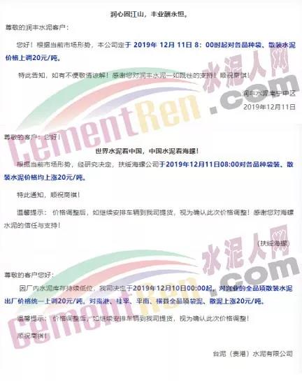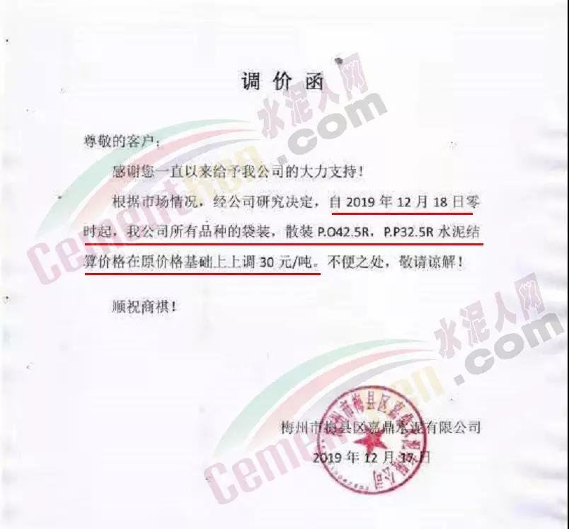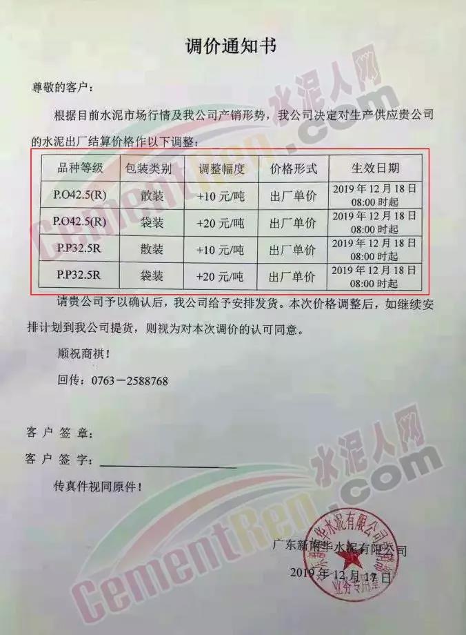 期中,梅州市塔牌營銷通知稱依照《水泥購銷合同》的約定,經(jīng)福建塔牌水泥有限公司授權(quán)通知及我公司研究決定,自2019年12月18日零時起,福建、梅州基地各廠所有水泥出廠結(jié)算價格在現(xiàn)行價格基礎(chǔ)上上調(diào)30元/噸。上周六(14日),這家企業(yè)剛剛通知福建、梅州各基地各廠所有散裝水泥出廠結(jié)算價格在現(xiàn)行價格基礎(chǔ)上上調(diào)40元/噸,所有袋裝水泥出廠結(jié)算價格在現(xiàn)行價格基礎(chǔ)上上調(diào)20元/噸。