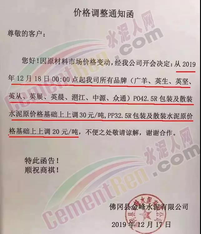 15日廣東省清遠(yuǎn)市及周邊區(qū)域多家企業(yè)通知上調(diào)水泥價格20-30元/噸,其中佛風(fēng)縣金峰水泥有限公司調(diào)價通知稱因原材料市場價格變動,從12月18日0時起公司所有品牌(廣羊、英生、英堅(jiān)、英從、英展、英晨、潖江、中原、眾通)PO42.5水泥包裝及散裝水泥原價格基礎(chǔ)上上調(diào)30元/噸,PP32.5R包裝及散裝水泥在原價格基礎(chǔ)上上調(diào)20元/噸。