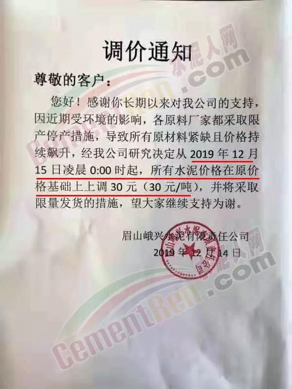 不僅廣東區(qū)域,近期四川眉山市、樂山市區(qū)域多家企業(yè)集體上調(diào)水泥價格。其中眉山峨興水泥有限責(zé)任公司調(diào)價通知稱,因近期受環(huán)境影響,各原料廠家都采取限產(chǎn)停產(chǎn)措施,導(dǎo)致所有原材料緊缺且價格持續(xù)飆升,經(jīng)公司研究決定從12月15日凌晨0點(diǎn)起,所有水泥價格在原價基礎(chǔ)上上調(diào)30元/噸,并將采取限量發(fā)貨措施。