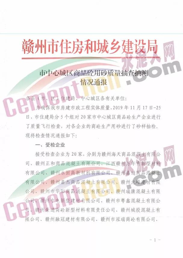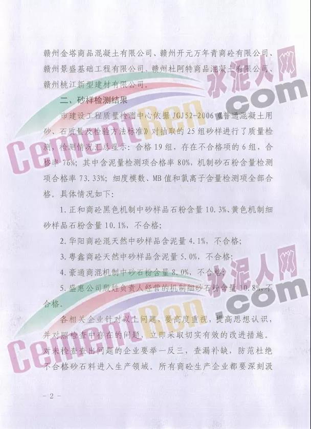 近日,江西省贛州市住建局分5個組對20家市中心城區(qū)商品砼生產(chǎn)企業(yè)進(jìn)行了質(zhì)量飛行檢查,對各企業(yè)的商砼生產(chǎn)用砂進(jìn)行了砂樣抽檢,其中5家商混企業(yè)檢測結(jié)果不合格。