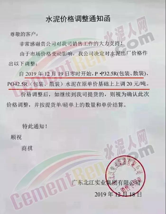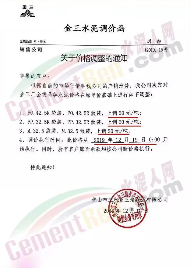 廣東區(qū)域,佛山金三水泥通知,根據(jù)當前的市場行情結(jié)合公司的產(chǎn)銷形勢,決定自今日(19日)0時起對金三廠全線品牌水泥在原單價基礎(chǔ)上上調(diào)20元/噸。
