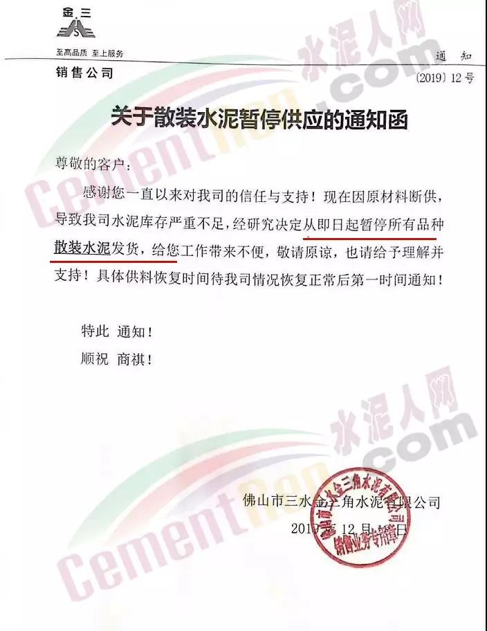 據(jù)了解,日前佛山市三水金三角水泥有限公司剛剛發(fā)布了散裝水泥停供通知。通知稱,因原材料斷供、導(dǎo)致公司水泥庫存嚴重不足,經(jīng)研究決定從即日起暫停所有品種散裝水泥。具體供料恢復(fù)時間等企業(yè)情況恢復(fù)正常后第一時間通知。
