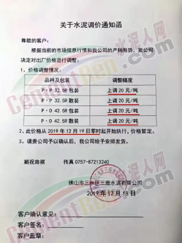 佛山市三水區(qū)三鹿水泥調(diào)價通知稱自今日(19日)零時起各標號水泥出廠價上調(diào)20元/噸。