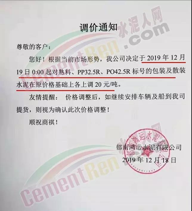 排隊船昨日(18日),四川區(qū)域各企業(yè)也通知上調(diào)水泥格30-40元/噸。其中長寧紅獅水泥調(diào)價通知稱,根據(jù)市場銷售情況,經(jīng)研究決定 從12月18日上午7時起,長寧紅獅生產(chǎn)的各規(guī)格包裝水泥合同價上調(diào)30元/噸,散裝水泥合同價上調(diào)40元/噸。