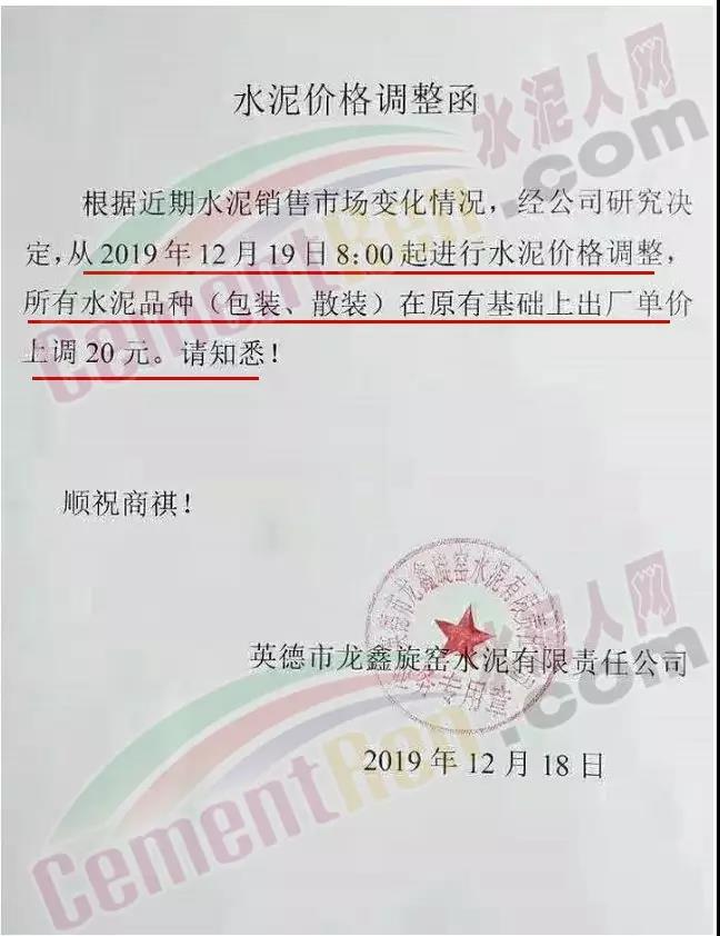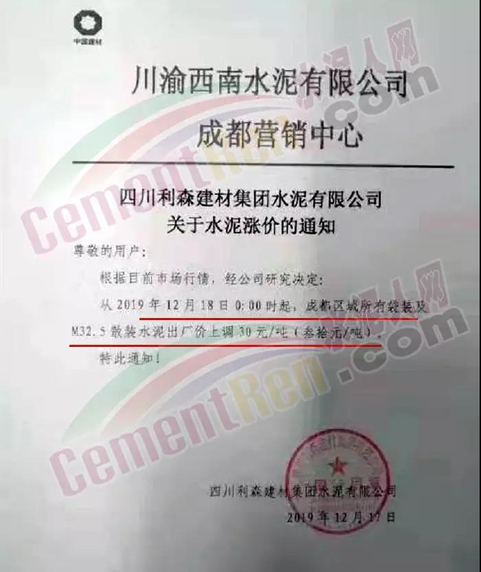 四川利森建材集團漲價通知稱,自12月18日零時起,成都區(qū)域所有袋裝及M32.5散裝水泥出廠價上調(diào)30元/噸。