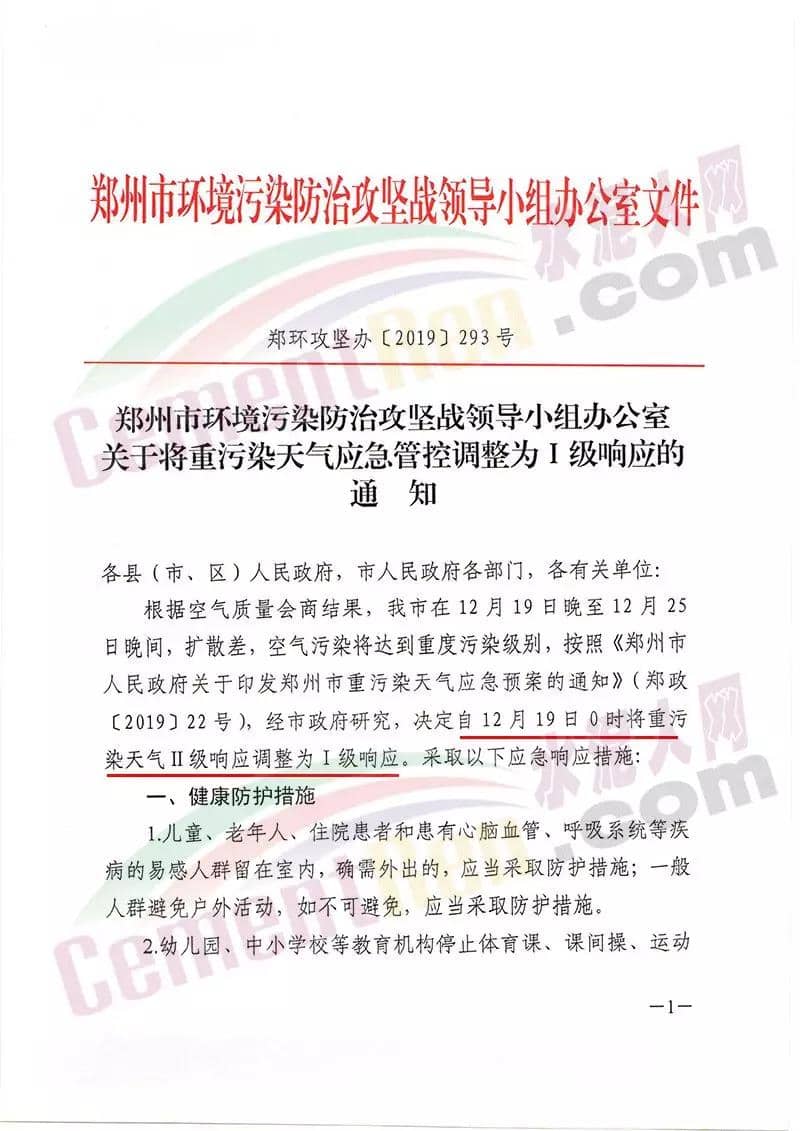 日前,鄭州市環(huán)境污染防治攻堅戰(zhàn)領(lǐng)導小組辦公室發(fā)布《關(guān)于將重污染天氣應急管控調(diào)整為I級響應的通知》稱根據(jù)空氣質(zhì)量會商結(jié)果,經(jīng)鄭州市政府研究決定自12月19日0時將重污染天氣II級響應調(diào)整為I級響應。