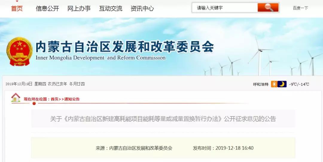 12月18日,內(nèi)蒙古自治區(qū)發(fā)展和改革委員會發(fā)布了《關于內(nèi)蒙古自治區(qū)新建高耗能項目能耗等量或減量置換暫行辦法公開征求意見的公告》稱,為控制全區(qū)能源消費過快增長,提高能源利用效率,依據(jù)相關政策制定《內(nèi)蒙古自治區(qū)新建高耗能項目能耗等量或減量置換暫行辦法》。