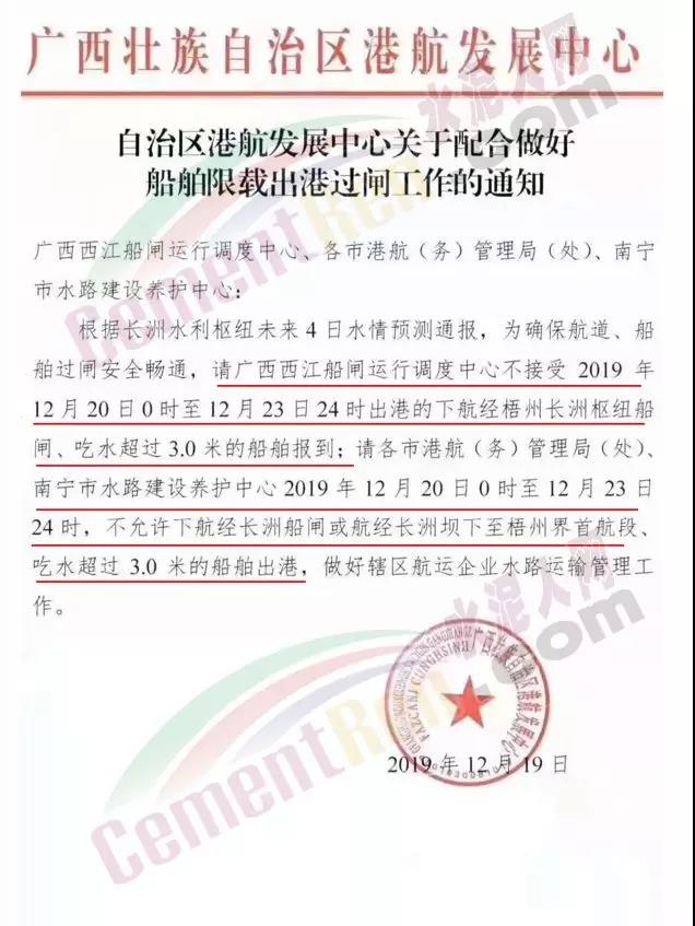 12月19日廣西壯族自治區(qū)港航發(fā)展中心發(fā)布《自治區(qū)港航發(fā)展中心關(guān)于配合做好船舶限載出港過閘工作的通知》稱:根據(jù)長洲水利樞紐未來4日水情預(yù)測(cè)通報(bào),為確保航道、船舶過閘安全暢通,請(qǐng)廣西西江船閘運(yùn)行調(diào)度中心不接受2019年12月20日0時(shí)至12月23日24時(shí)出港的下航經(jīng)梧州長洲樞紐船閘、吃水超過3.0米的船舶報(bào)到;請(qǐng)各市港航(務(wù))管理局(處)、南寧市水路建設(shè)養(yǎng)護(hù)中心2019年12月20日0時(shí)至12月23日24時(shí),不允許下航經(jīng)長洲船閘或航經(jīng)長洲壩下至梧州界首航段、吃水超過3.0米的船舶出港,做好轄區(qū)航運(yùn)企業(yè)水路運(yùn)輸管理工作。