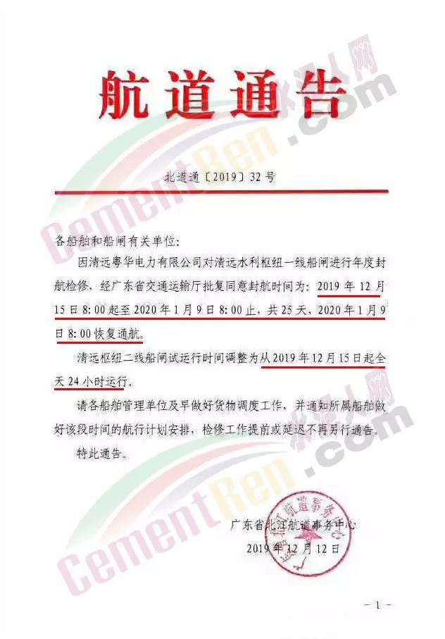 在這之前廣東省北江航道事務(wù)中心也發(fā)布第32號(hào)航道通告稱,因清遠(yuǎn)粵華電力有限公司對(duì)清遠(yuǎn)水利樞紐一線船閘進(jìn)行年度封航檢修,經(jīng)廣東省交通運(yùn)輸廳批復(fù)同意封航時(shí)間為2019年12月15日8時(shí)起至2020年1月9日8時(shí)止,共25天,1月9日8時(shí)恢復(fù)通航。