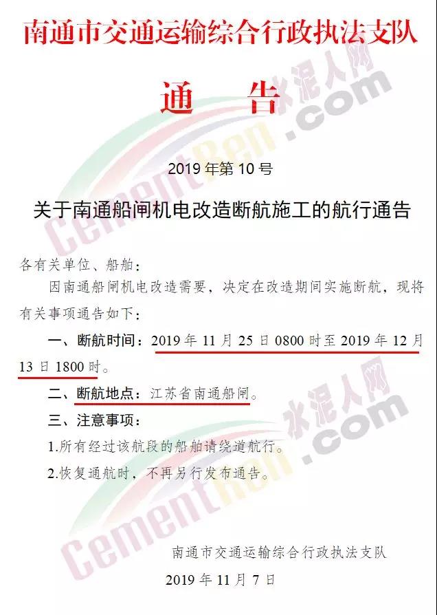 上個(gè)月南通市交通運(yùn)輸綜合行政執(zhí)法支隊(duì)發(fā)布《關(guān)于南通船閘機(jī)電改造斷航施工的航行通告》(2019年第10號(hào))稱因南通船閘機(jī)電改造需要,決定在改造期間實(shí)施斷航。斷航時(shí)間11月25日8時(shí)至12月13日18時(shí)。斷航地址為江蘇省南通船閘。要求所有經(jīng)過該航段的船舶繞道航行。