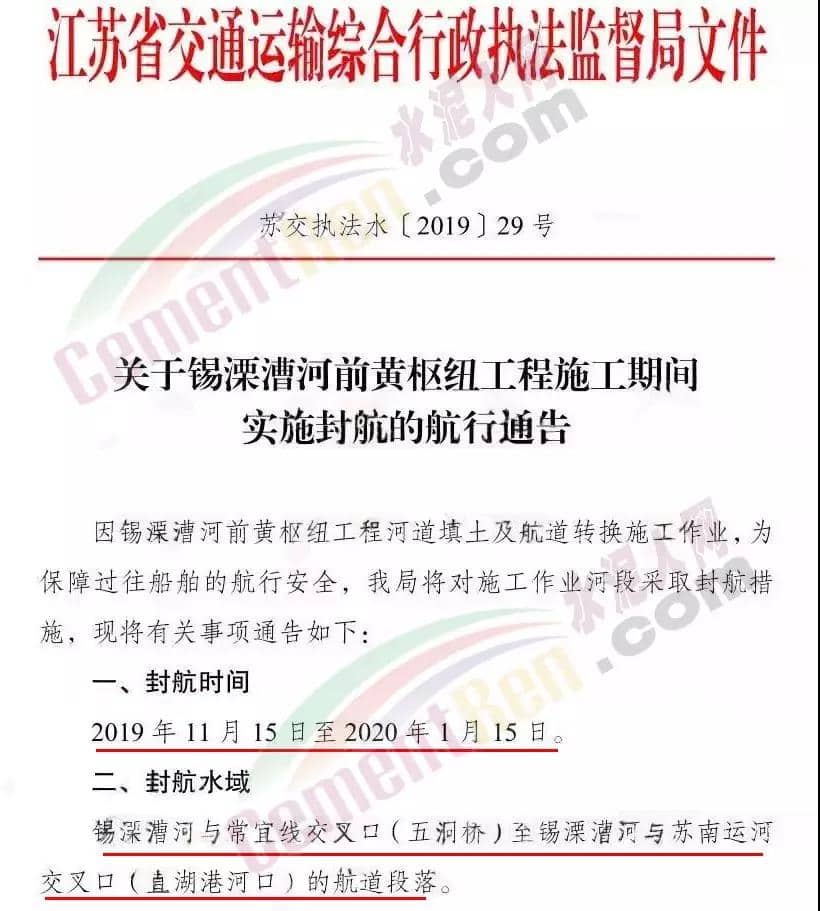 江蘇省交通運(yùn)輸綜合行政執(zhí)法監(jiān)督局發(fā)布《關(guān)于錫溧漕河前黃樞紐工程施工期間實(shí)施封航的航行通告》(蘇交執(zhí)法水〔2019〕29 號(hào))。錫溧漕河前黃樞紐工程河道填土及航道封航時(shí)間為2019 年 11 月 15 日至 2020 年 1 月 15 日。封航水域?yàn)殄a溧漕河與常宜線交叉口(五洞橋)至錫溧漕河與蘇南運(yùn)河交叉口(直湖港河口)的航道段落。封航期間途經(jīng)船舶必須從蕪申運(yùn)河、丹金溧漕河、京杭運(yùn)河繞行,同時(shí)禁止300噸以上、船寬7米以上的船舶通過武宜運(yùn)河、老錫溧漕河(太滆運(yùn)河)繞行。