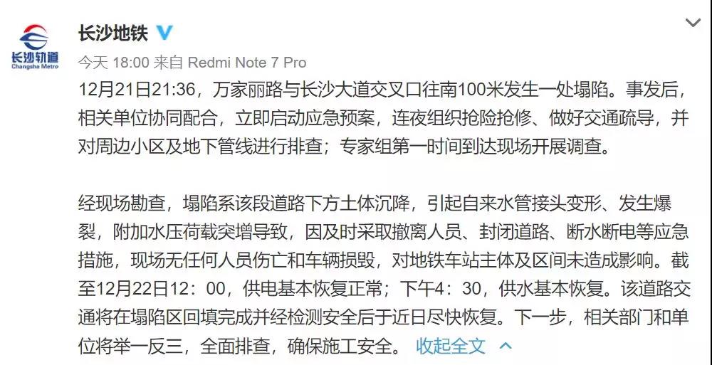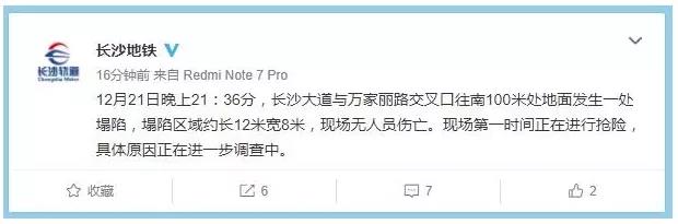 12月21日23時50分,長沙地鐵官方微博通報稱,當(dāng)日21時36分,長沙大道與萬家麗路交叉口往南100米處地面發(fā)生一處塌陷,塌陷區(qū)域約長12米寬8米,現(xiàn)場無人員傷亡。現(xiàn)場第一時間正在進行搶險,具體原因正在進一步調(diào)查中。