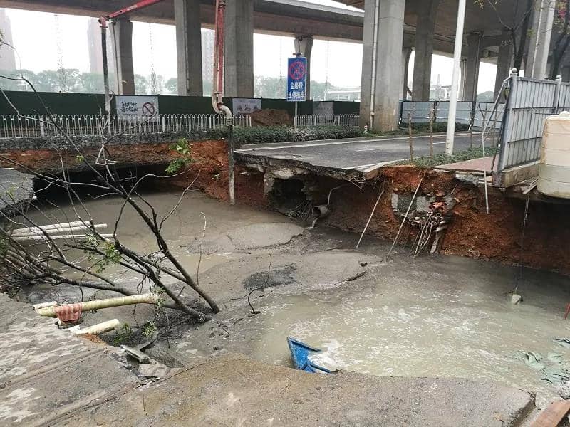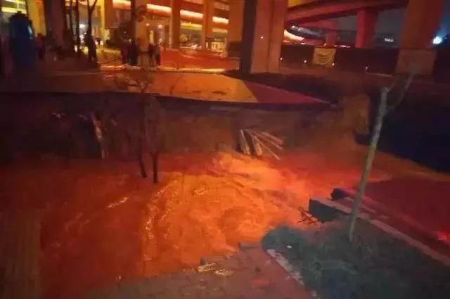 塌陷路面位于高架橋下,塌陷寬度有數(shù)米寬,塌陷區(qū)內(nèi)有管道向外涌水,且水位不斷上升。