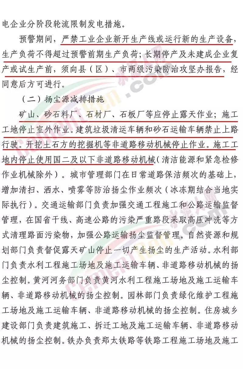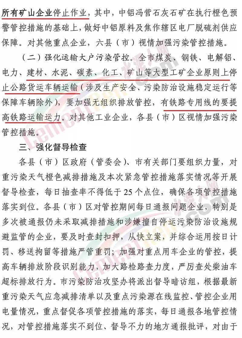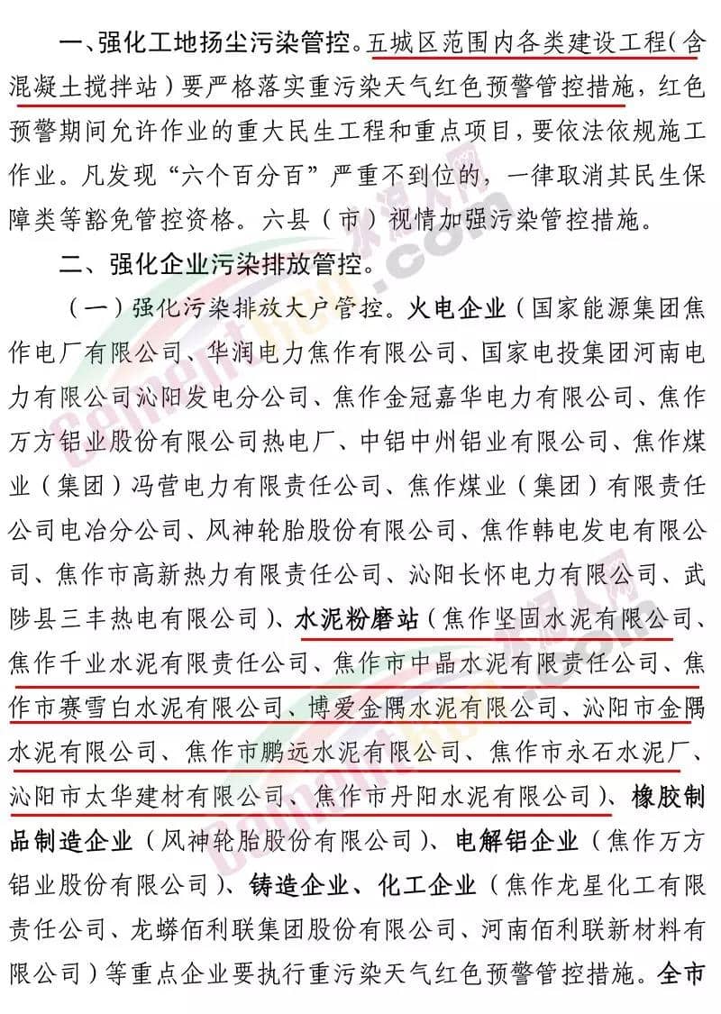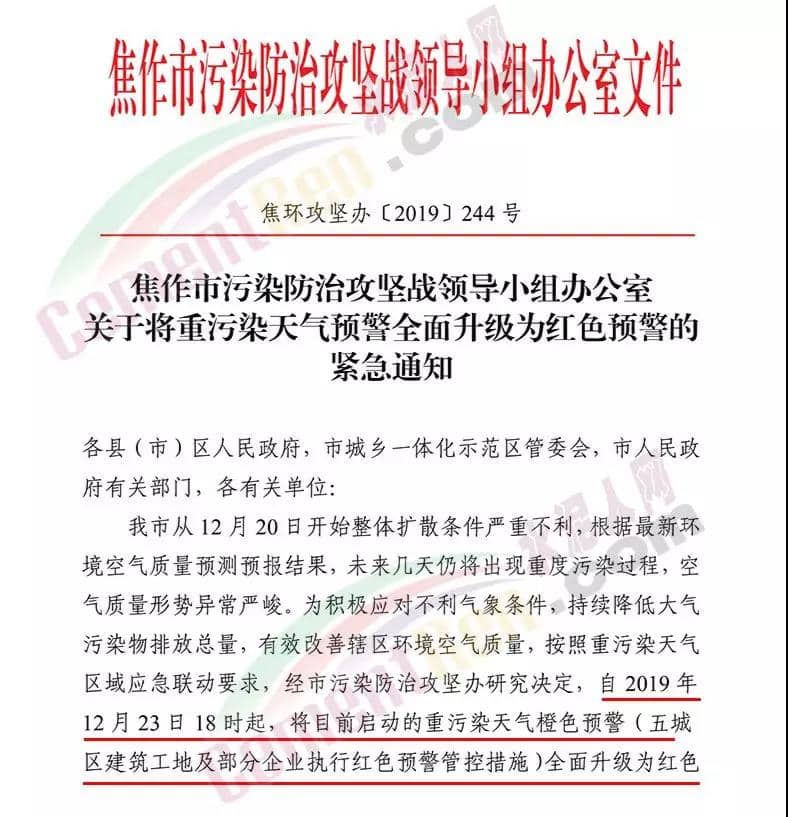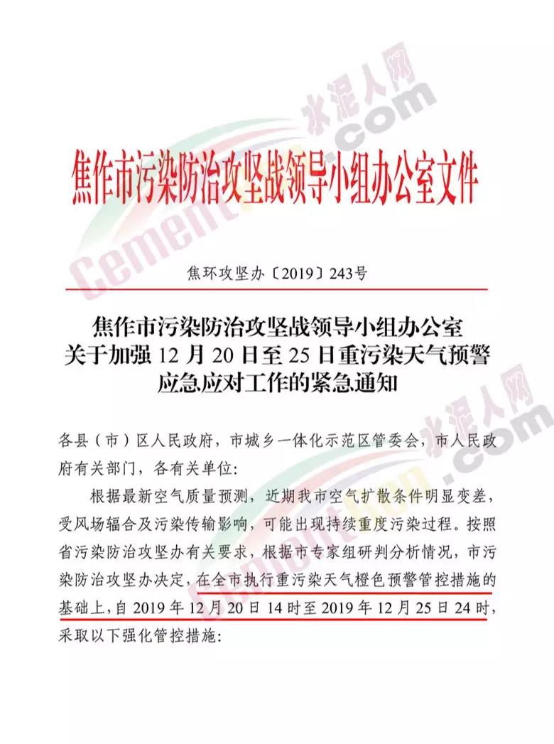 據(jù)了解,12 月 19 日焦作市污染防治攻堅(jiān)戰(zhàn)領(lǐng)導(dǎo)小組辦公室 曾發(fā)布《關(guān)于加強(qiáng) 12 月 20 日至 25 日重污染天氣預(yù)警 應(yīng)急應(yīng)對(duì)工作的緊急通知》要求在全市執(zhí)行重污染天氣橙色預(yù)警管控措施的 基礎(chǔ)上,自 2019 年 12 月 20 日 14 時(shí)至 2019 年 12 月 25 日 24 時(shí), 采取以下強(qiáng)化管控措施強(qiáng)化工地?fù)P塵污染管控。五城區(qū)范圍內(nèi)各類建設(shè)工程(含混凝土攪拌站)要嚴(yán)格落實(shí)重污染天氣紅色預(yù)警管控措施,紅色預(yù)警期間允許作業(yè)的重大民生工程和重點(diǎn)項(xiàng)目,要依法依規(guī)施工作業(yè)。強(qiáng)化污染排放大戶管控。水泥粉磨站(焦作堅(jiān)固水泥有限公司、 焦作千業(yè)水泥有限責(zé)任公司、焦作市中晶水泥有限責(zé)任公司、焦作市賽雪白水泥有限公司、博愛(ài)金隅水泥有限公司、沁陽(yáng)市金隅水泥有限公司、焦作市鵬遠(yuǎn)水泥有限公司、焦作市永石水泥廠、 沁陽(yáng)市太華建材有限公司、焦作市丹陽(yáng)水泥有限公司)。全市所有礦山企業(yè)停止作業(yè)。強(qiáng)化運(yùn)輸大戶污染管控。全市煤炭、鋼鐵、電解鋁、 電力、建材、水泥、碳素、化工、礦山等大型工礦企業(yè)原則上停止公路貨運(yùn)車輛運(yùn)輸(涉及生產(chǎn)安全、污染防治設(shè)施穩(wěn)定運(yùn)行等 保障車輛除外),要加強(qiáng)無(wú)組織排放管控,有鐵路專用線的要提高鐵路運(yùn)輸運(yùn)力。對(duì)其他工業(yè)企業(yè),各縣(市)區(qū)視情加強(qiáng)污染 管控措施。通知原文如下: