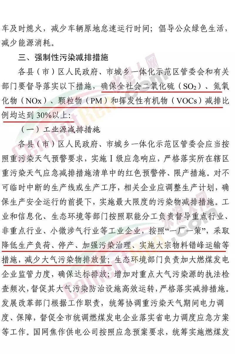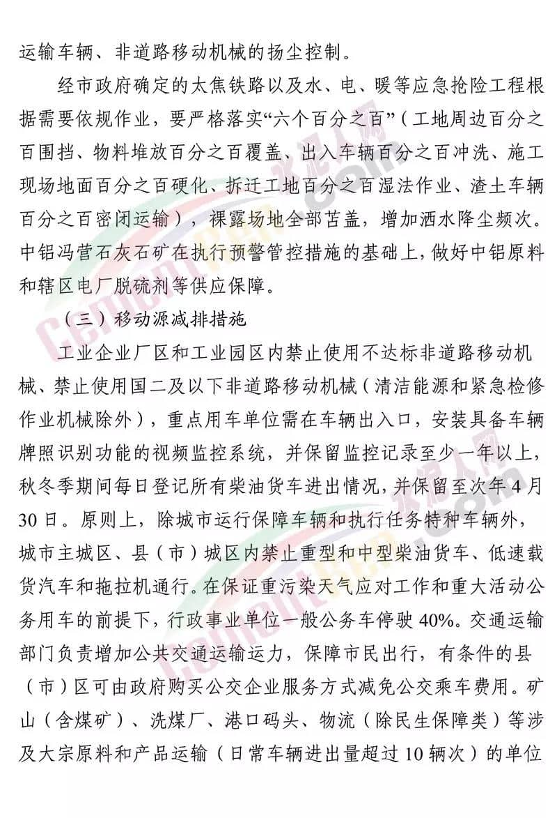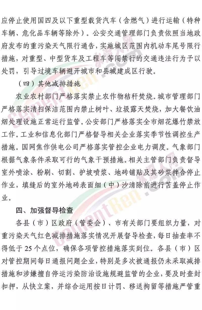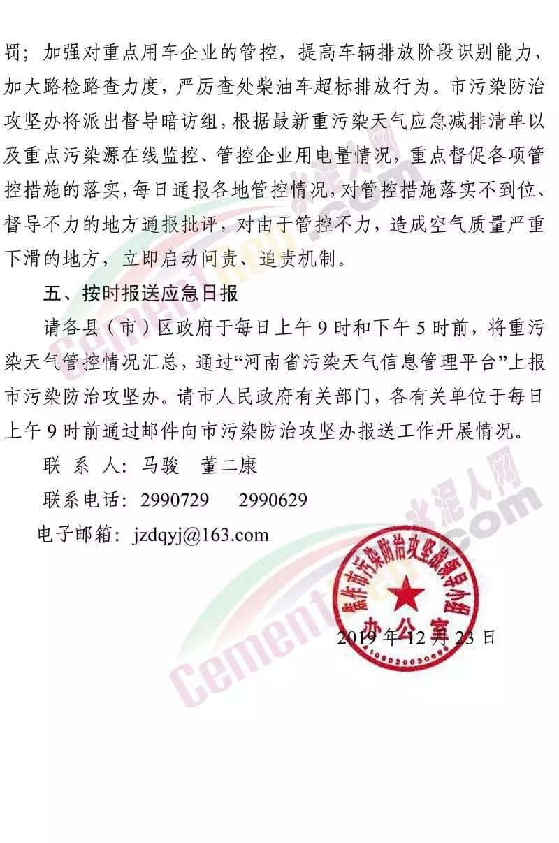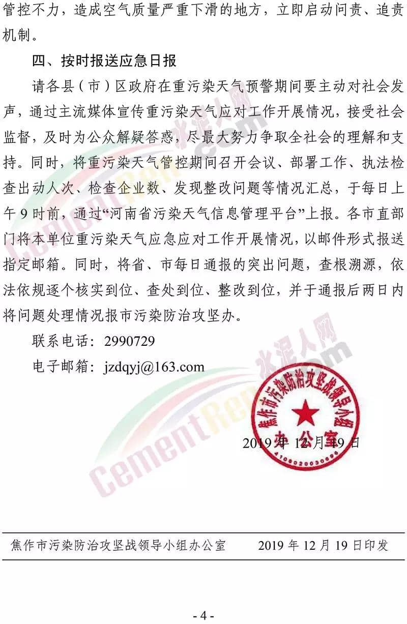據(jù)了解,12 月 19 日焦作市污染防治攻堅(jiān)戰(zhàn)領(lǐng)導(dǎo)小組辦公室 曾發(fā)布《關(guān)于加強(qiáng) 12 月 20 日至 25 日重污染天氣預(yù)警 應(yīng)急應(yīng)對(duì)工作的緊急通知》要求在全市執(zhí)行重污染天氣橙色預(yù)警管控措施的 基礎(chǔ)上,自 2019 年 12 月 20 日 14 時(shí)至 2019 年 12 月 25 日 24 時(shí), 采取以下強(qiáng)化管控措施強(qiáng)化工地?fù)P塵污染管控。五城區(qū)范圍內(nèi)各類建設(shè)工程(含混凝土攪拌站)要嚴(yán)格落實(shí)重污染天氣紅色預(yù)警管控措施,紅色預(yù)警期間允許作業(yè)的重大民生工程和重點(diǎn)項(xiàng)目,要依法依規(guī)施工作業(yè)。強(qiáng)化污染排放大戶管控。水泥粉磨站(焦作堅(jiān)固水泥有限公司、 焦作千業(yè)水泥有限責(zé)任公司、焦作市中晶水泥有限責(zé)任公司、焦作市賽雪白水泥有限公司、博愛(ài)金隅水泥有限公司、沁陽(yáng)市金隅水泥有限公司、焦作市鵬遠(yuǎn)水泥有限公司、焦作市永石水泥廠、 沁陽(yáng)市太華建材有限公司、焦作市丹陽(yáng)水泥有限公司)。全市所有礦山企業(yè)停止作業(yè)。強(qiáng)化運(yùn)輸大戶污染管控。全市煤炭、鋼鐵、電解鋁、 電力、建材、水泥、碳素、化工、礦山等大型工礦企業(yè)原則上停止公路貨運(yùn)車輛運(yùn)輸(涉及生產(chǎn)安全、污染防治設(shè)施穩(wěn)定運(yùn)行等 保障車輛除外),要加強(qiáng)無(wú)組織排放管控,有鐵路專用線的要提高鐵路運(yùn)輸運(yùn)力。對(duì)其他工業(yè)企業(yè),各縣(市)區(qū)視情加強(qiáng)污染 管控措施。通知原文如下: