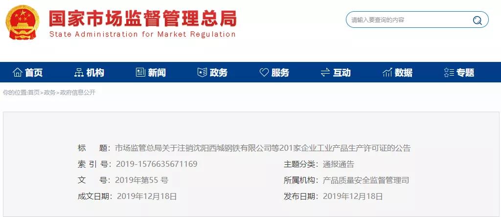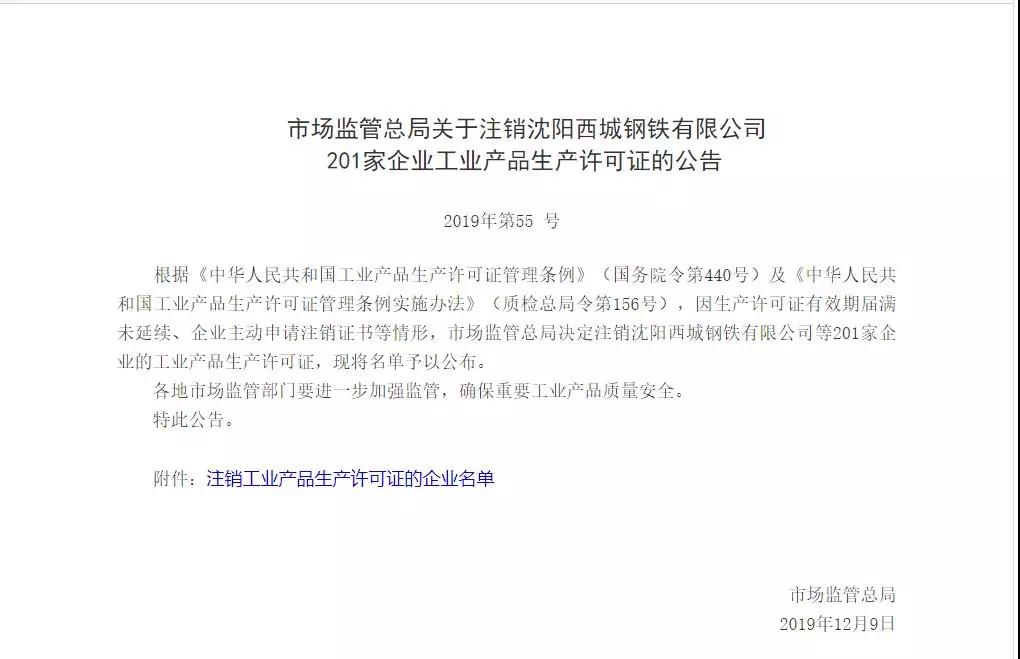 日前,國家市場監(jiān)督管理總局發(fā)布了《市場監(jiān)管總局關(guān)于注銷沈陽西城鋼鐵有限公司201家企業(yè)工業(yè)產(chǎn)品生產(chǎn)許可證的公告》稱,根據(jù)《中華人民共和國工業(yè)產(chǎn)品生產(chǎn)許可證管理條例》(國務(wù)院令第440號)及《中華人民共和國工業(yè)產(chǎn)品生產(chǎn)許可證管理條例實施辦法》(質(zhì)檢總局令第156號),因生產(chǎn)許可證有效期屆滿未延續(xù)、企業(yè)主動申請注銷證書等情形。