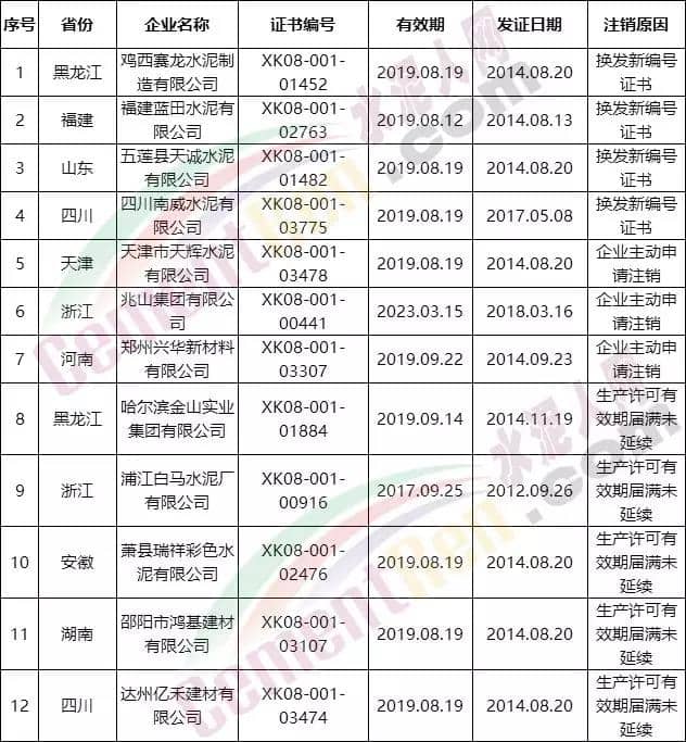 據(jù)了解,名單中包括12家水泥生產(chǎn)企業(yè),分別為天津市天輝水泥有限公司、雞西賽龍水泥制造有限公司、兆山集團有限公司浦江白馬水泥廠有限公司、蕭縣瑞祥彩色水泥有限公司、福建藍田水泥有限公司、五蓮縣天誠水泥有限公司、鄭州興華新材料有限公司、邵陽市鴻基建材有限公司、達州億禾建材有限公司、四川南威水泥有限公司、哈爾濱金山實業(yè)集團有限公司12家水泥企業(yè)。
