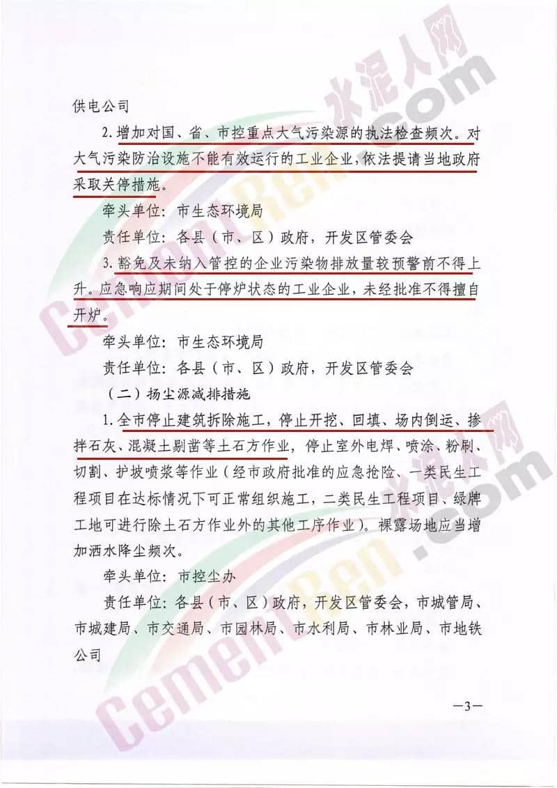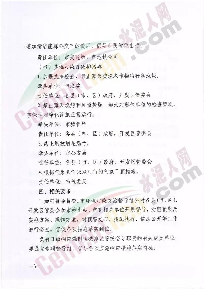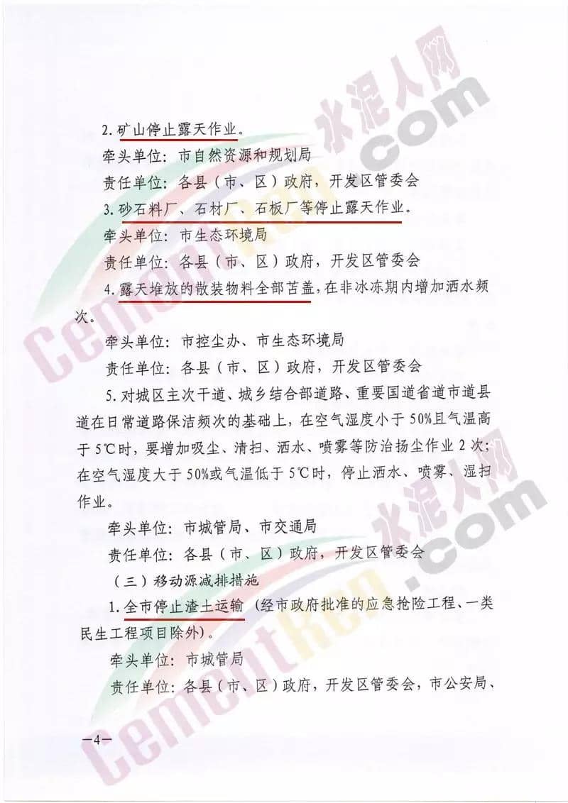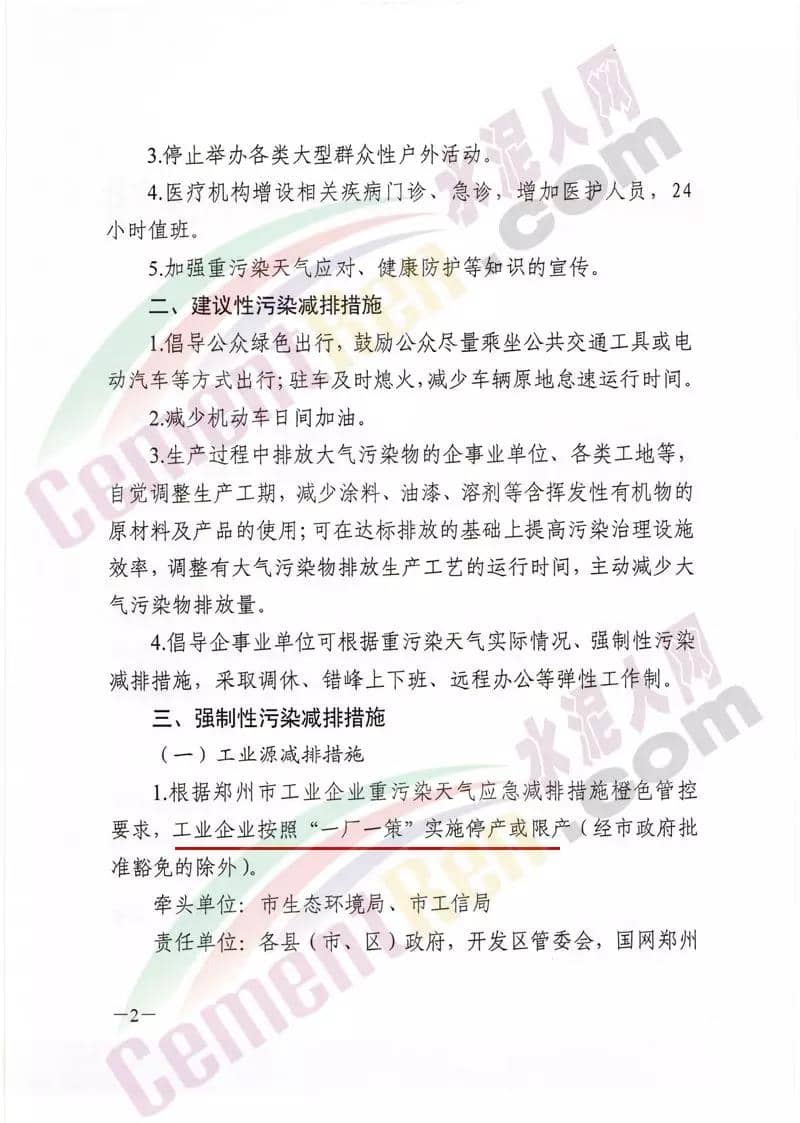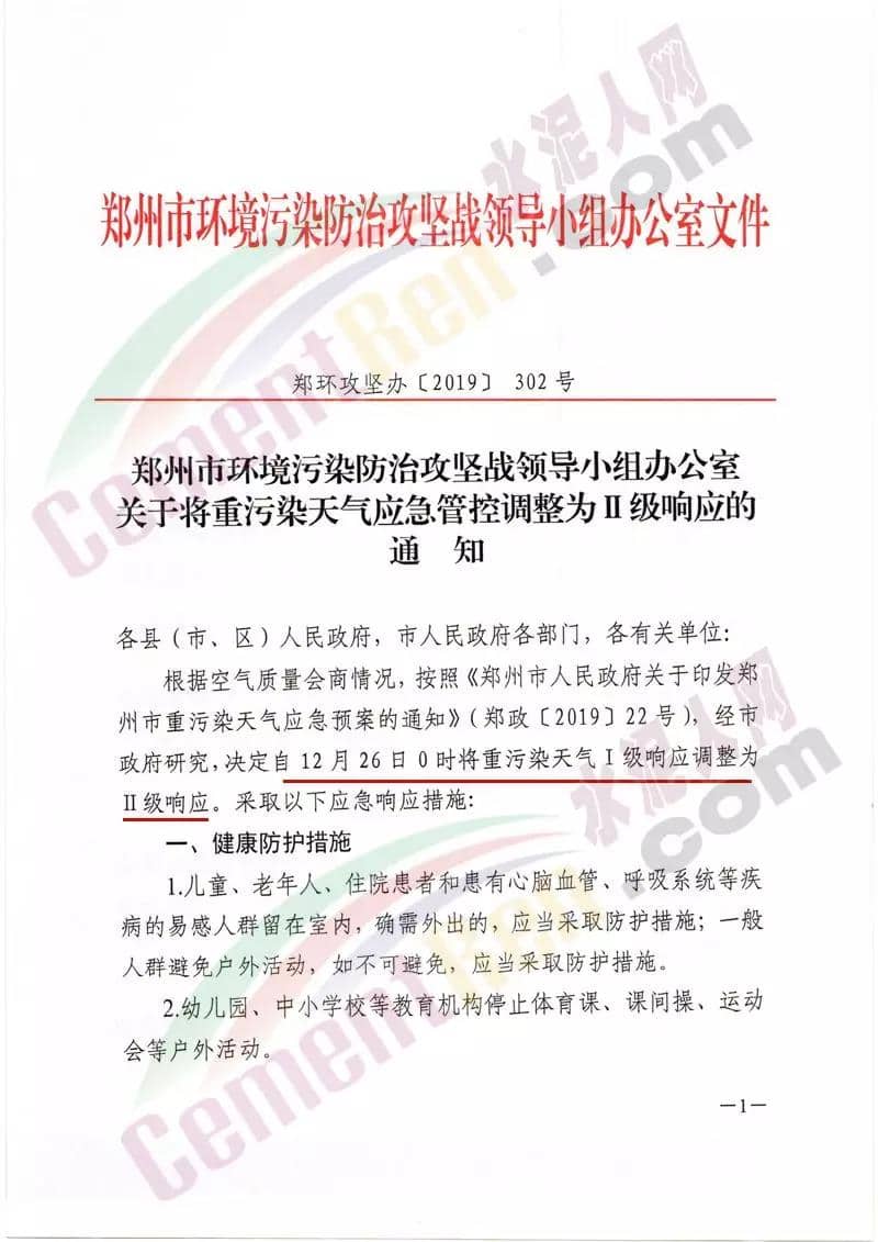 昨日(24日),鄭州市環(huán)境污染防治攻堅戰(zhàn)領(lǐng)導(dǎo)小組辦公室印發(fā)了《關(guān)于將重污染天氣應(yīng)急管控調(diào)整為II級響應(yīng)的通知》稱,根據(jù)空氣質(zhì)量會商情況,按照《鄭州市人民政府關(guān)于印發(fā)鄭州市重污染天氣應(yīng)急預(yù)案的通知》(鄭政〔2019〕22號),經(jīng)市政府研究,決定自12月26日0時將重污染天氣Ⅰ級響應(yīng)調(diào)整為Ⅱ級響應(yīng)。并提出如下要求:根據(jù)鄭州市工業(yè)企業(yè)重污染天氣應(yīng)急減排措施橙色管控要求,工業(yè)企業(yè)按照“一廠一策”實施停產(chǎn)或限產(chǎn)。增加對國、省、市控重點大氣污染源的執(zhí)法檢查頻次。對大氣污染防治設(shè)施不能有效運行的工業(yè)企業(yè),依法提請當(dāng)?shù)卣扇£P(guān)停措施。豁免及未納入管控的企業(yè)污染物排放量較預(yù)警前不得上升。應(yīng)急響應(yīng)期間處于停爐狀態(tài)的工業(yè)企業(yè),未經(jīng)批準不得擅自開爐。全市停止建筑拆除施工,停止開挖、回填、場內(nèi)倒運、摻拌石灰、混凝土剔鑿等土石方作業(yè), 停止室外電焊、噴涂、粉刷、切割、護坡噴漿等作業(yè)(經(jīng)市政府批準的應(yīng)急搶險、一類民生工程項目在達標(biāo)情況下可正常組織施工,二類民生工程項目、綠牌工地可進行除土石方作業(yè)外的其他工序作業(yè))。裸露場地應(yīng)當(dāng)增加灑水降塵頻次。礦山停止露天作業(yè)。砂石料廠、石材廠、石板廠等停止露天作業(yè)。露天堆放的散裝物料全部苫蓋,在非冰凍期內(nèi)增加灑水頻次。全市停止渣土運輸 (經(jīng)市政府批準的應(yīng)急搶險工程、一類民生工程項目除外)。全市停止水泥罐車、建筑物料運輸 (經(jīng)市政府批準的應(yīng)急搶險、一類民生、二類民生工程、綠牌工地除外)。非道路移動機械(含裝載機、平地機、挖掘機、壓路機、鋪路機、叉車等)停止使用(經(jīng)批準的允許橙色預(yù)警響應(yīng)期間可以正常生產(chǎn)、施工的企業(yè)、工地除外);允許作業(yè)的非道路移動機械應(yīng)達到國三排放標(biāo)準并粘貼綠色環(huán)保標(biāo)識,或使用電動非道路移動機械。允許運輸?shù)碾姀S、各類企業(yè)、礦山、工地、大型批發(fā)市場和物流園區(qū)禁止使用國四及以下(含燃氣)重型載貨車輛(特種車輛、?;奋囕v除外);在應(yīng)急響應(yīng)期間要每日登記所有柴油貨車進出情況,保留視頻監(jiān)控記錄三個月以上。通知全文如下:
