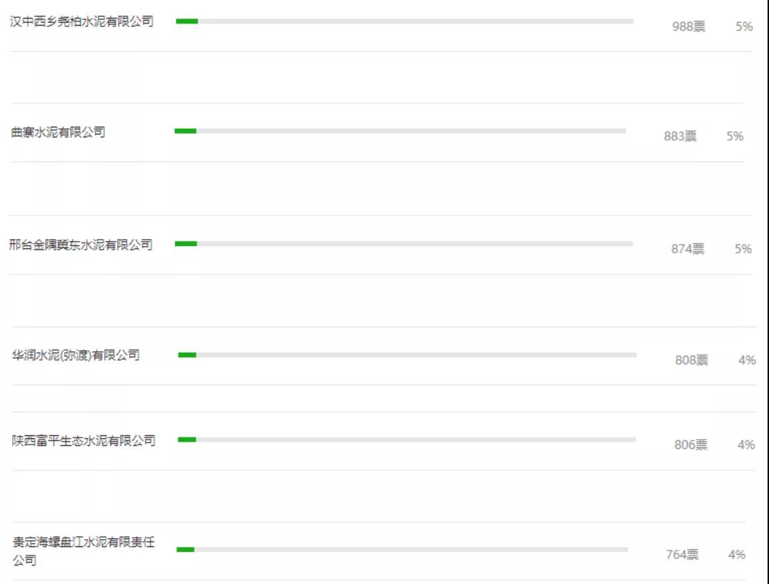 一、邯鄲涉縣金隅水泥3872票。二、四川星船城水泥股份有限公司1560票。三、福州臺(tái)泥水泥有限公司位居前三位1537票。四、尖峰水泥1072票。五、漢中西鄉(xiāng)堯柏水泥有限公司988票。六、曲寨水泥有限公司883票。七、邢臺(tái)金隅冀東水泥有限公司874票。八、華潤(rùn)水泥(彌渡)有限公司808票。九、陜西富平生態(tài)水泥有限公司806票。十、貴定海螺盤江水泥有限責(zé)任公司764票。