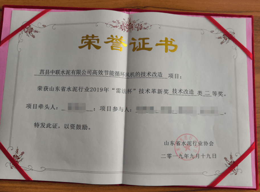 其中,高效節(jié)能循環(huán)風(fēng)機(jī)的技術(shù)改造項(xiàng)目榮獲山東省水泥行業(yè)2019年“雷法杯”技術(shù)革新獎(jiǎng)技術(shù)改造類二等獎(jiǎng)。