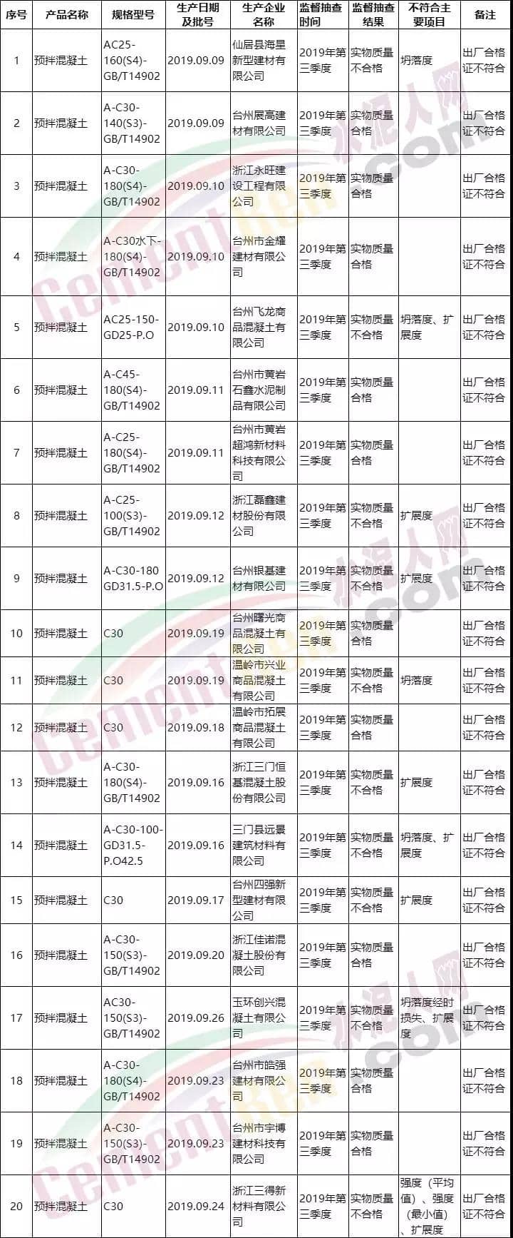 12月24日,臺(tái)州市市場監(jiān)督管理局官網(wǎng)發(fā)布2019年預(yù)拌混凝土產(chǎn)品質(zhì)量專項(xiàng)監(jiān)督抽查結(jié)果信息。