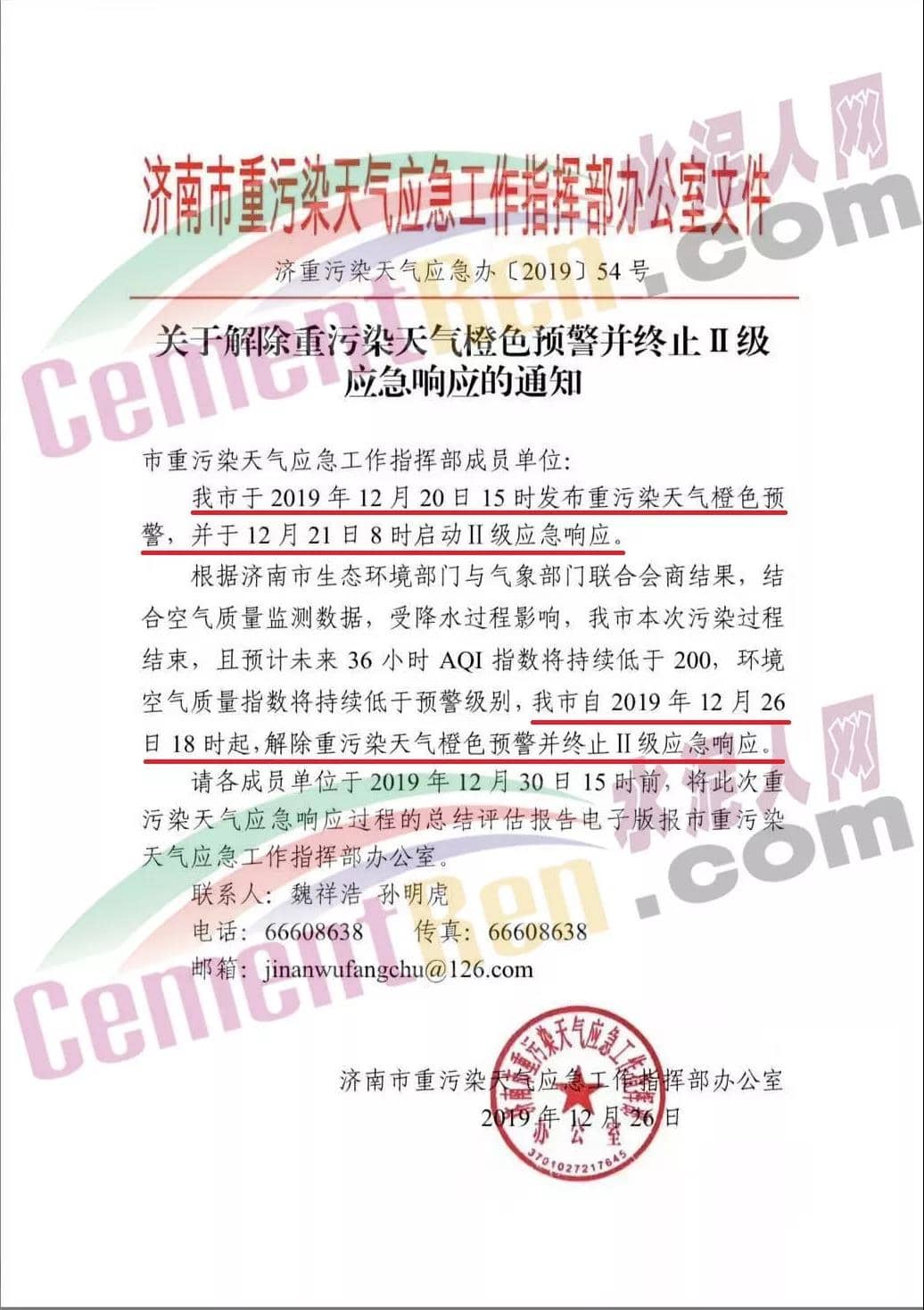 同期,山東省濟南市重污染天氣應(yīng)急工作指揮部辦公室發(fā)布了《關(guān)于解除重污染天氣橙色預(yù)警并終止II級應(yīng)急響應(yīng)的通知》稱,自2019年12月26日18時起,解除重污染天氣橙色預(yù)警并終止II級應(yīng)急響應(yīng)。通知原文如下: