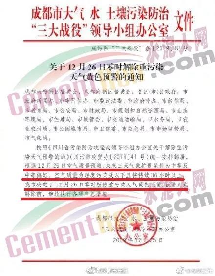 12月25日,四川省成都市大氣水土壤污染防治三大戰(zhàn)役領(lǐng)導(dǎo)小組辦公室發(fā)布了《關(guān)于12月26日零時解除重污染天氣黃色預(yù)警的通知》稱,成都市定于12月26日零時解除重污染天氣黃色預(yù)警,預(yù)警正式解除前,繼續(xù)執(zhí)行各項應(yīng)急措施。通知原文如下0: