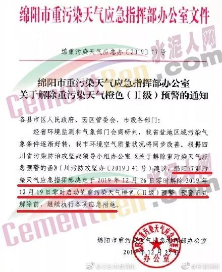 同期,四川省綿陽市重污染天氣應(yīng)急指揮部辦公室發(fā)布了《關(guān)于解除重污染天氣橙色(II級)預(yù)警的通知》稱,綿陽市重污染天氣應(yīng)急指揮部定于2019年12月26日零時解除2019年12月19日零時啟動的重污染天氣橙色(II級)預(yù)警,預(yù)警正是解除前,繼續(xù)執(zhí)行各項應(yīng)急措施。通知原文如下: