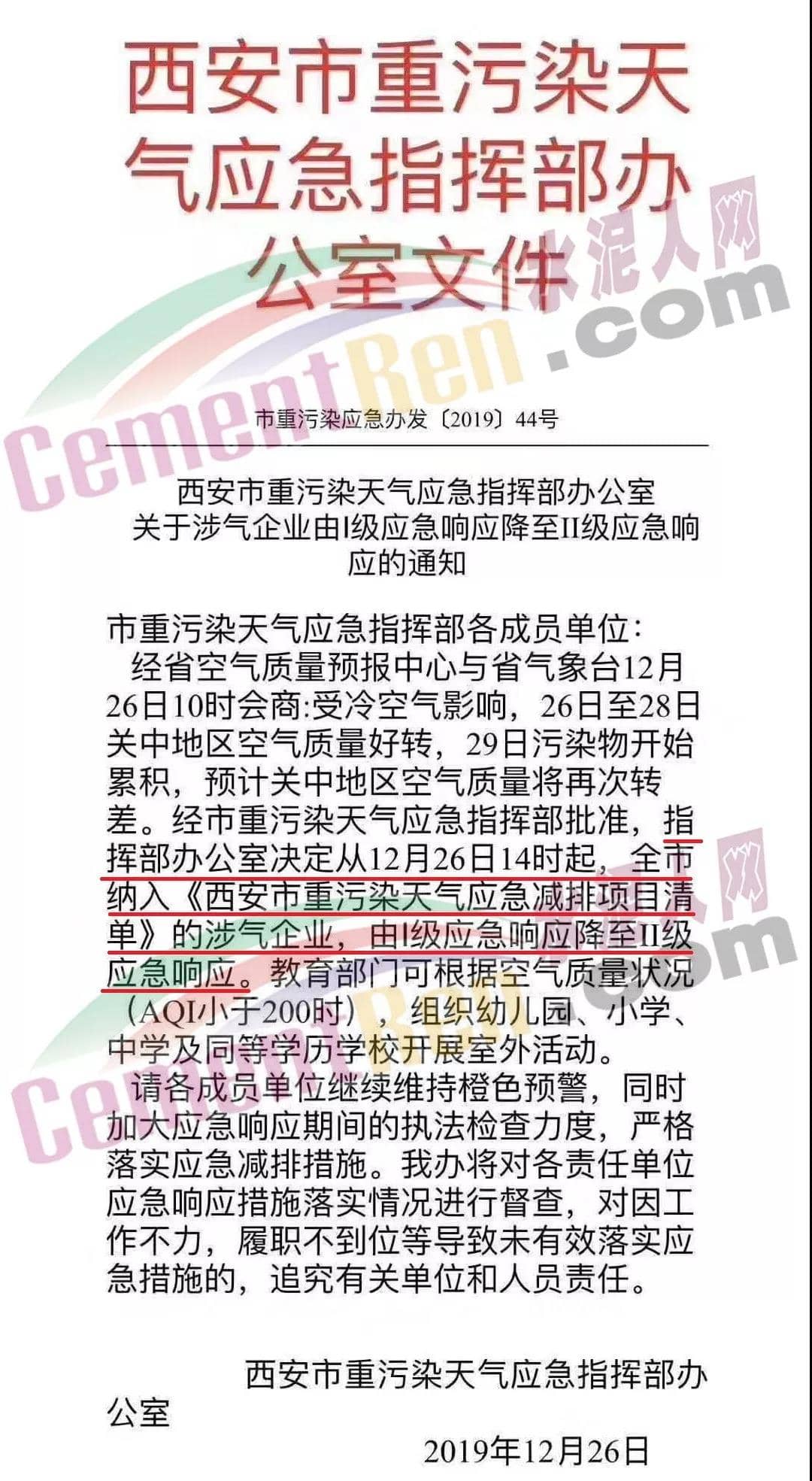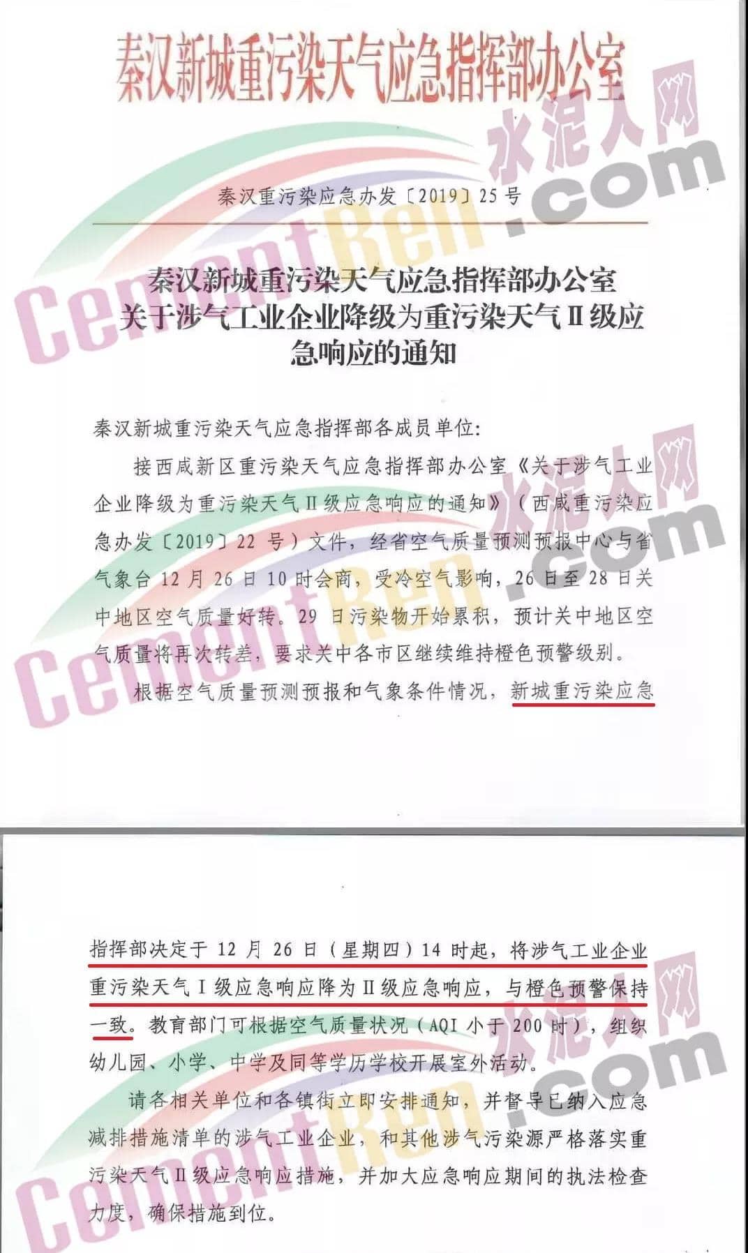 12月26日,陜西省西安市重污染天氣應(yīng)急指揮部辦公室發(fā)布了《關(guān)于涉氣企業(yè)由I級應(yīng)急響應(yīng)降至II級應(yīng)急響應(yīng)的通知》稱,西安市指揮部辦公室定于12月26日14時起,全西安市納入《西安市重污染天氣應(yīng)急減排項目清單》的涉氣企業(yè),由I級應(yīng)急響應(yīng)降至II級應(yīng)急響應(yīng)。通知原文如下: